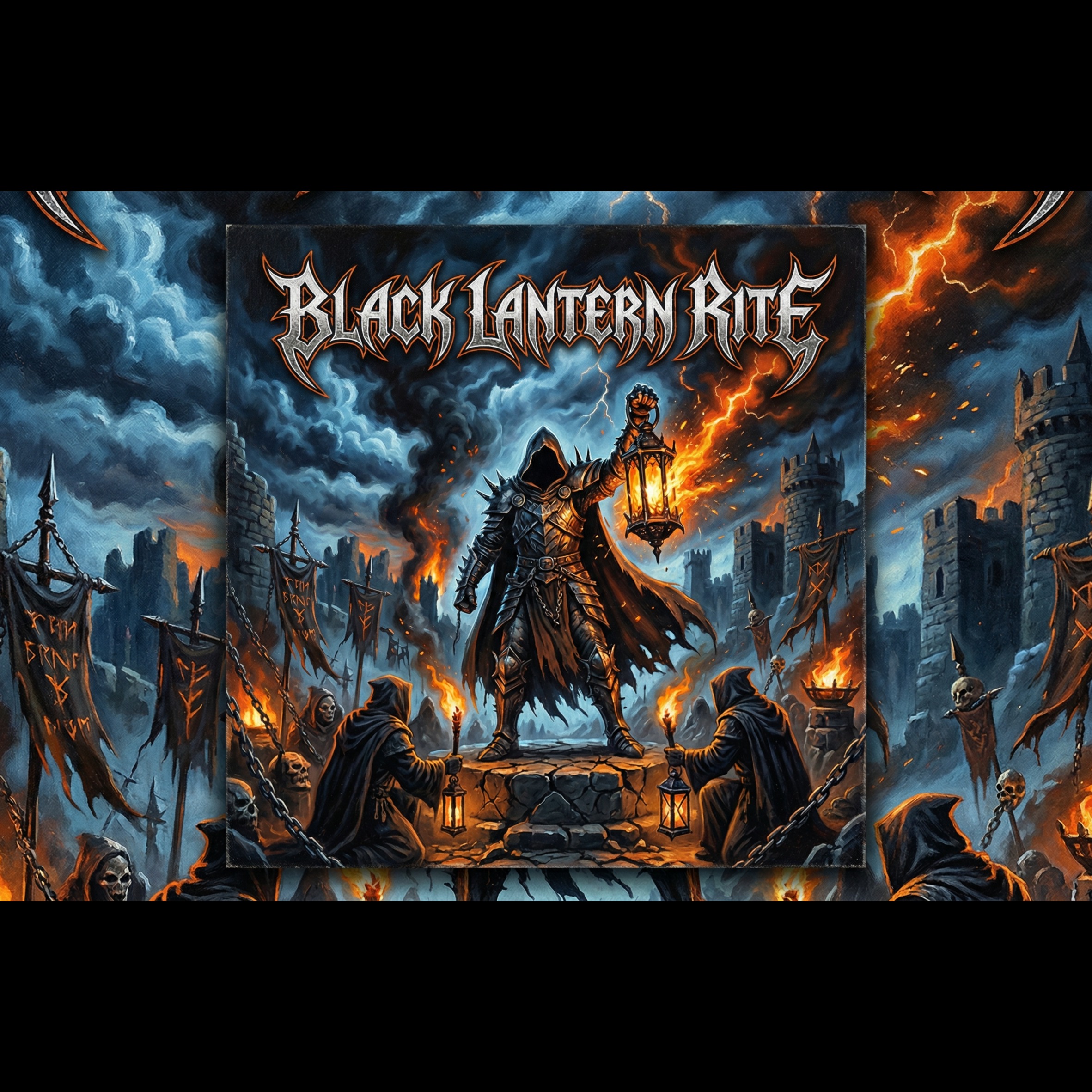 European underground traditional heavy metal, 1990s to now, built from obscure continental steel rather than any one band, Title: Black Lantern Rite, Key: E minor, Tempo: 142 BPM, Use tight 4/4 drums, galloping rhythm guitars, melodic bass that stays audible, twin-lead harmonies, sharp but concise solos, and a clear mix with analog grit, Vocals: forceful male tenor, gritty midrange, high chorus lift, crowd chants, no pop gloss, Mood: occult midnight heavy metal; imagery and subtext: lanterns, shadows, ancient vow, Arrangement: short cold intro, riff-heavy verse, rising pre-chorus, huge anthem chorus, second verse with more lead motion, bridge, solo, final double chorus, Direction: French-German dark traditional metal, Crowd chant: Wolf blood under loud glory and loud glory of holy thunder!European underground traditional heavy metal, 1990s to now, built from obscure continental steel rather tha