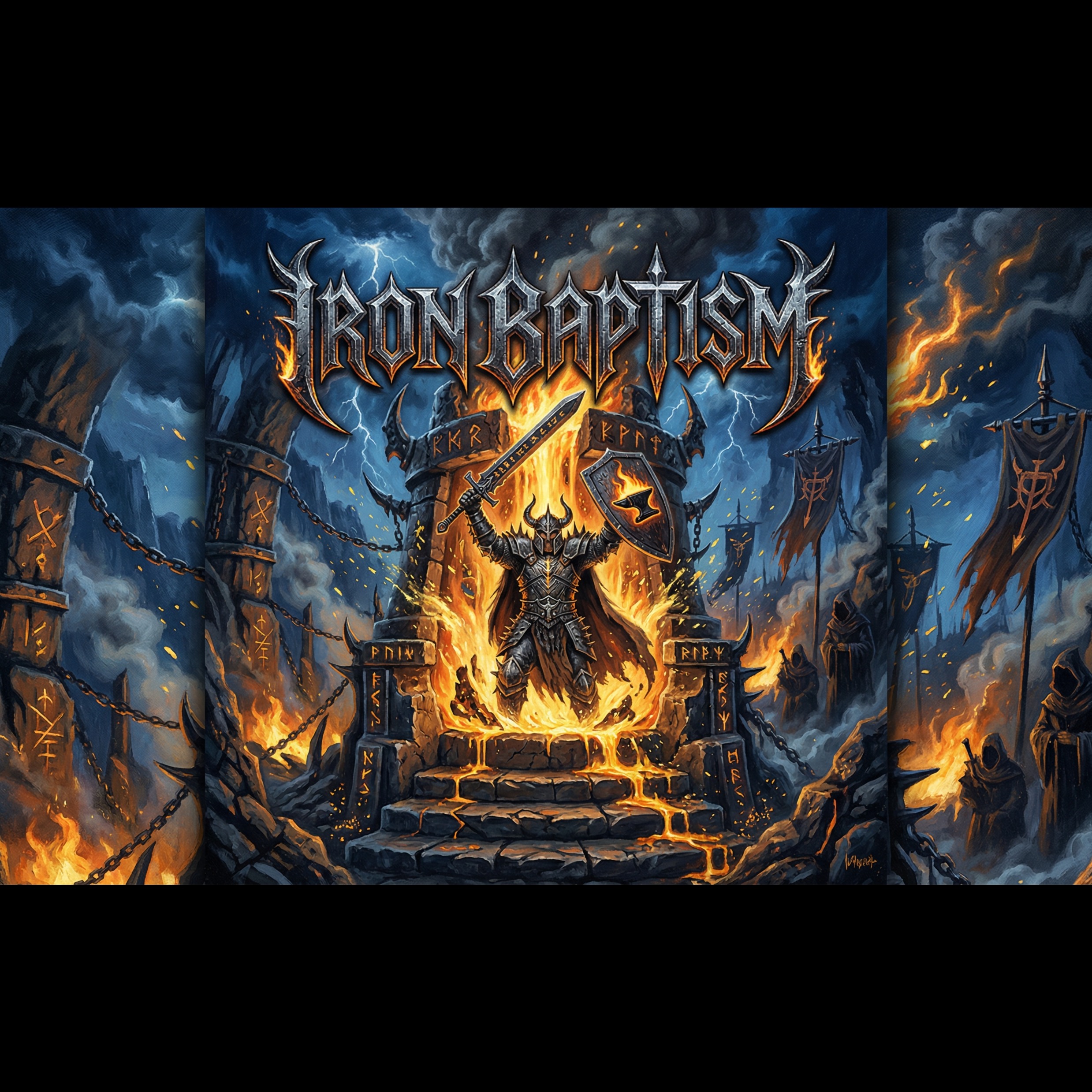 European underground traditional heavy metal, 1990s to now, built from obscure continental steel rather than any one band, Title: Iron Baptism, Key: C minor, Tempo: 150 BPM, Use tight 4/4 drums, galloping rhythm guitars, melodic bass that stays audible, twin-lead harmonies, sharp but concise solos, and a clear mix with analog grit, Vocals: forceful male tenor, gritty midrange, high chorus lift, crowd chants, no pop gloss, Mood: ritual fire heavy metal; imagery and subtext: ritual furnace, rebirth, molten faith, Arrangement: short cold intro, riff-heavy verse, rising pre-chorus, huge anthem chorus, second verse with more lead motion, bridge, solo, final double chorus, Direction: Swedish revivalist heavy/speed metal, Crowd chant: Chrome heart beyond sacred noise under iron wolves of midnight