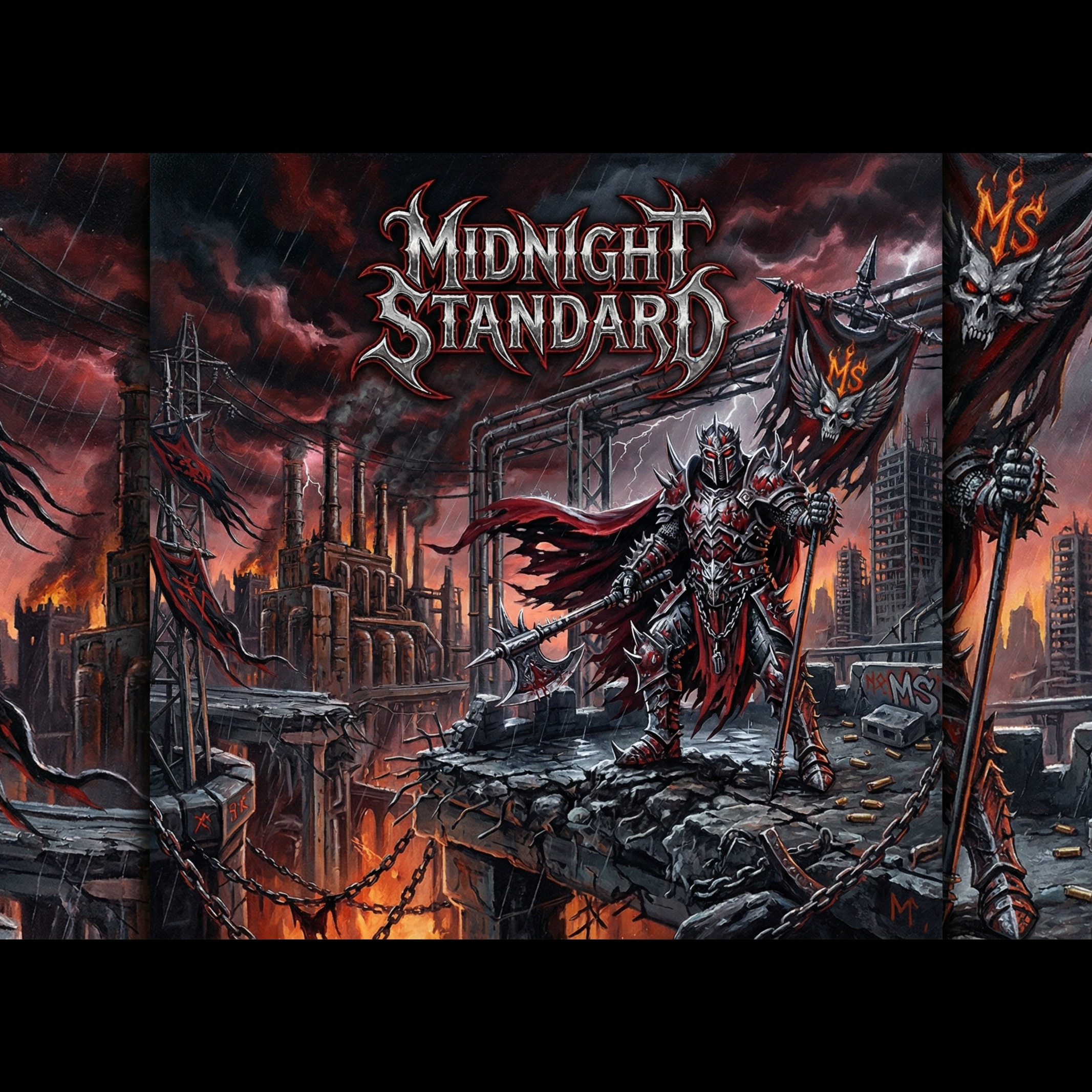 European underground traditional heavy metal, 1990s to now, built from obscure continental steel rather than any one band, Title: Midnight Standard, Key: F# minor, Tempo: 152 BPM, Use tight 4/4 drums, galloping rhythm guitars, melodic bass that stays audible, twin-lead harmonies, sharp but concise solos, and a clear mix with analog grit, Vocals: forceful male tenor, gritty midrange, high chorus lift, crowd chants, no pop gloss, Mood: urban warrior metal; imagery and subtext: night patrol, chrome, code of honor, Arrangement: short cold intro, riff-heavy verse, rising pre-chorus, huge anthem chorus, second verse with more lead motion, bridge, solo, final double chorus, Direction: Swedish revivalist heavy/speed metal, Crowd chant: Northern fire beyond steel under battle cry under holy thunder