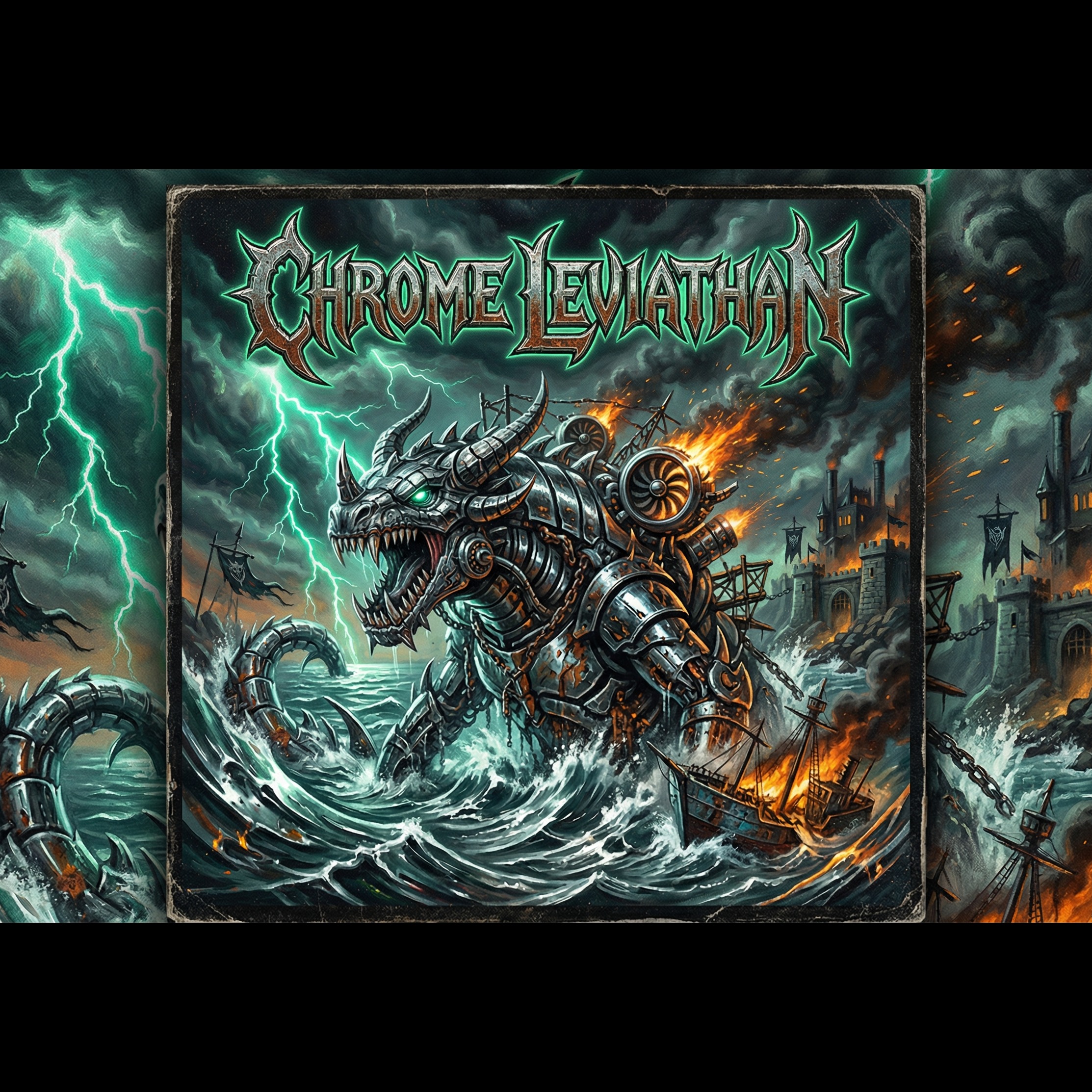 European underground traditional heavy metal, 1990s to now, built from obscure continental steel rather than any one band, Title: Chrome Leviathan, Key: G minor, Tempo: 154 BPM, Use tight 4/4 drums, galloping rhythm guitars, melodic bass that stays audible, twin-lead harmonies, sharp but concise solos, and a clear mix with analog grit, Vocals: forceful male tenor, gritty midrange, high chorus lift, crowd chants, no pop gloss, Mood: industrial-sea beast metal; imagery and subtext: chrome ocean, leviathan, turbines, Arrangement: short cold intro, riff-heavy verse, rising pre-chorus, huge anthem chorus, second verse with more lead motion, bridge, solo, final double chorus, Direction: Germanic dystopian classic steel, Crowd chant: Sacred noise under signal fire and northern fire, gold banners