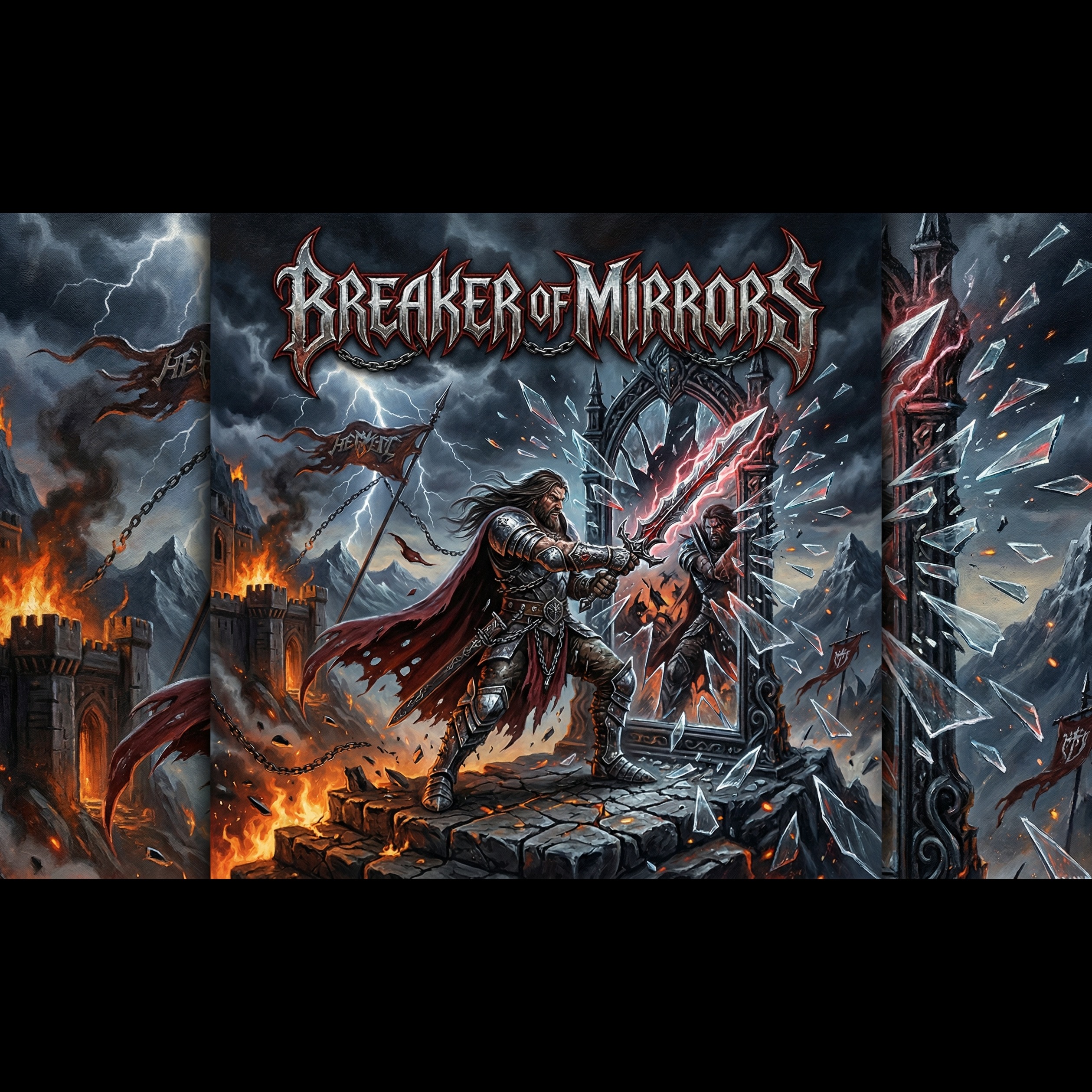 European underground traditional heavy metal, 1990s to now, built from obscure continental steel rather than any one band, Title: Breaker of Mirrors, Key: F# minor, Tempo: 150 BPM, Use tight 4/4 drums, galloping rhythm guitars, melodic bass that stays audible, twin-lead harmonies, sharp but concise solos, and a clear mix with analog grit, Vocals: forceful male tenor, gritty midrange, high chorus lift, crowd chants, no pop gloss, Mood: self-conquest heavy metal; imagery and subtext: reflection, breaking fate, inner war, Arrangement: short cold intro, riff-heavy verse, rising pre-chorus, huge anthem chorus, second verse with more lead motion, bridge, solo, final double chorus, Direction: Pan-European melodic traditional metal, Crowd chant: Burning crowns beyond holy thunder and sacred noise!