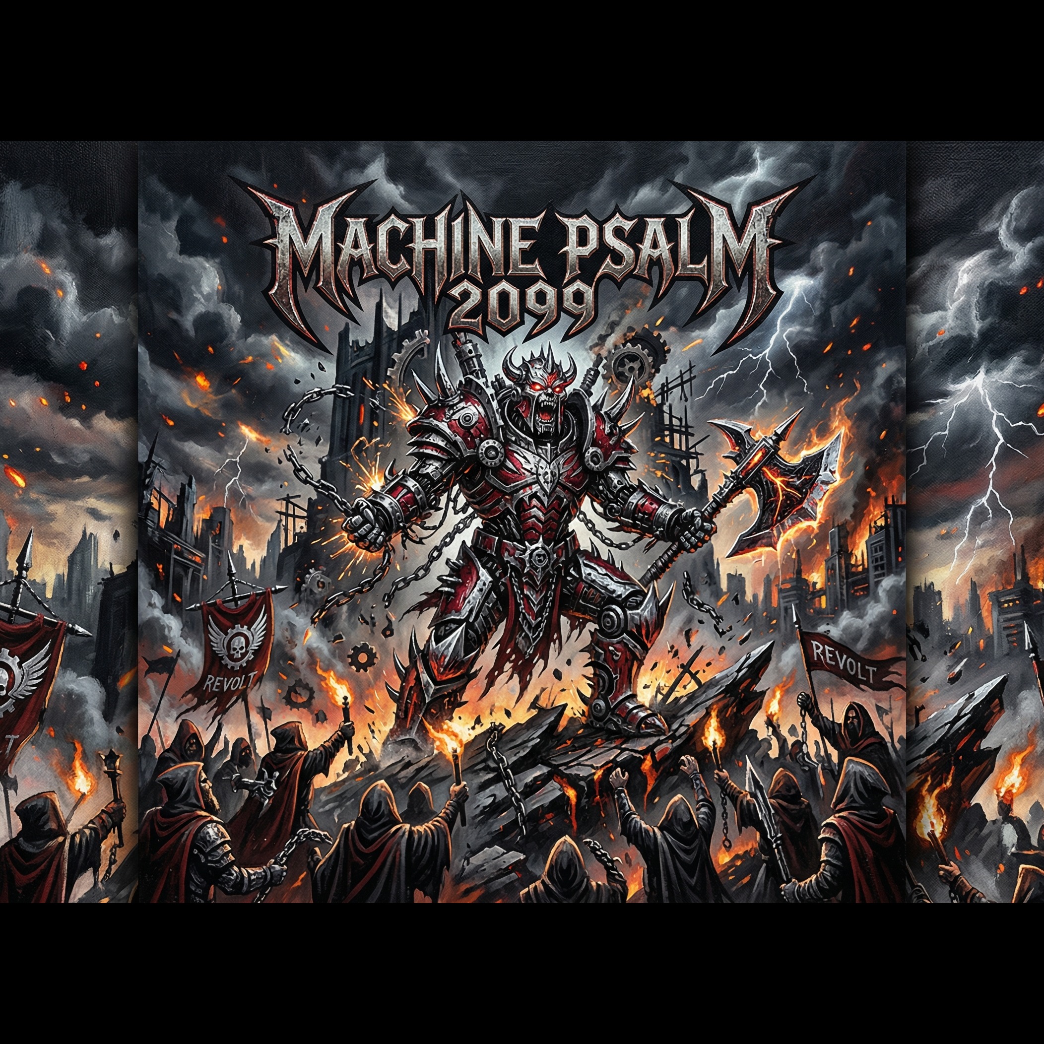 European underground traditional heavy metal, 1990s to now, built from obscure continental steel rather than any one band, Title: Machine Psalm 2099, Key: F minor, Tempo: 150 BPM, Use tight 4/4 drums, galloping rhythm guitars, melodic bass that stays audible, twin-lead harmonies, sharp but concise solos, and a clear mix with analog grit, Vocals: forceful male tenor, gritty midrange, high chorus lift, crowd chants, no pop gloss, Mood: apocalyptic cyber-heavy metal; imagery and subtext: machines, static, prayer, revolt, Arrangement: short cold intro, riff-heavy verse, rising pre-chorus, huge anthem chorus, second verse with more lead motion, bridge, solo, final double chorus, Direction: Germanic dystopian classic steel, Crowd chant: Roaring night, venom sky and wild ride under eternal storm