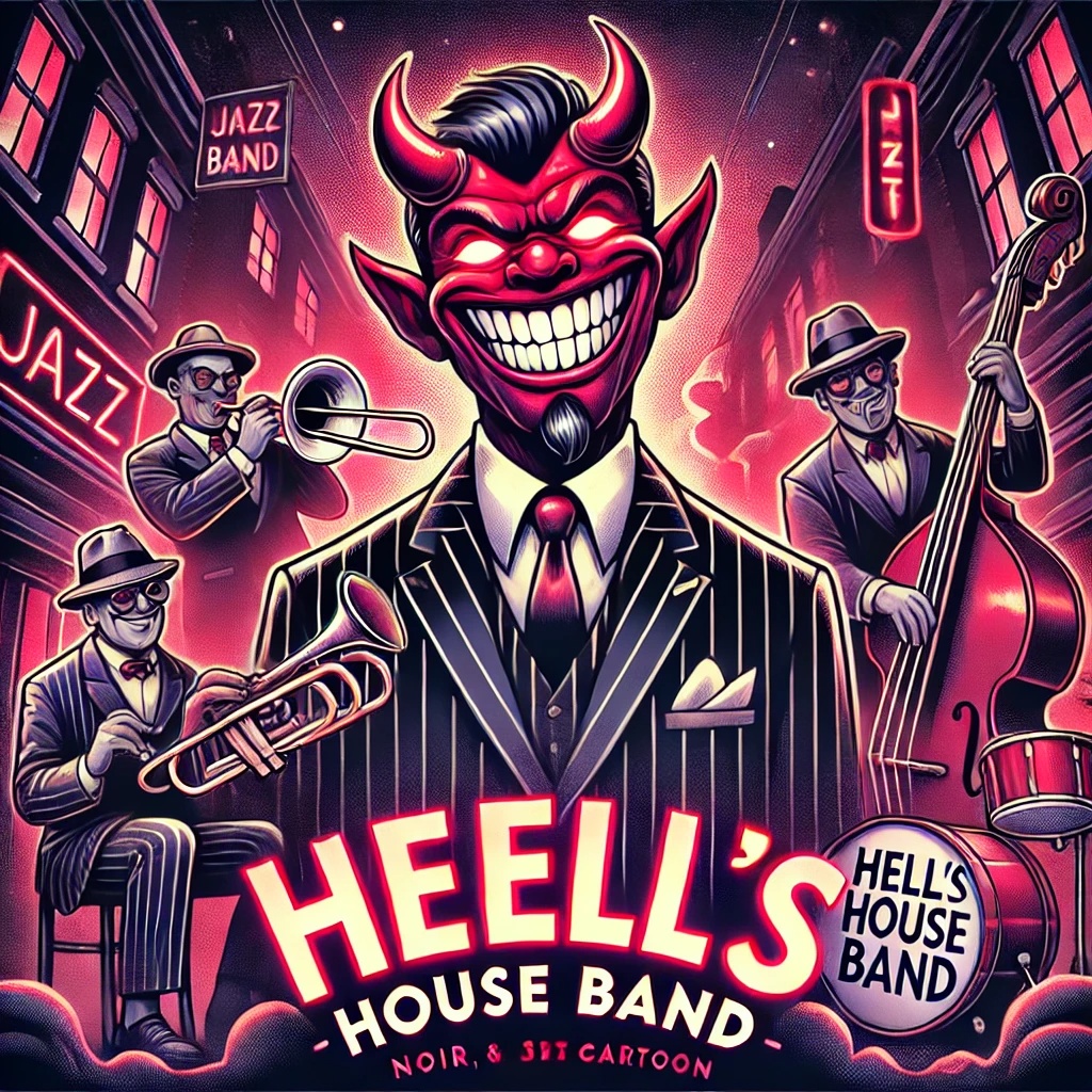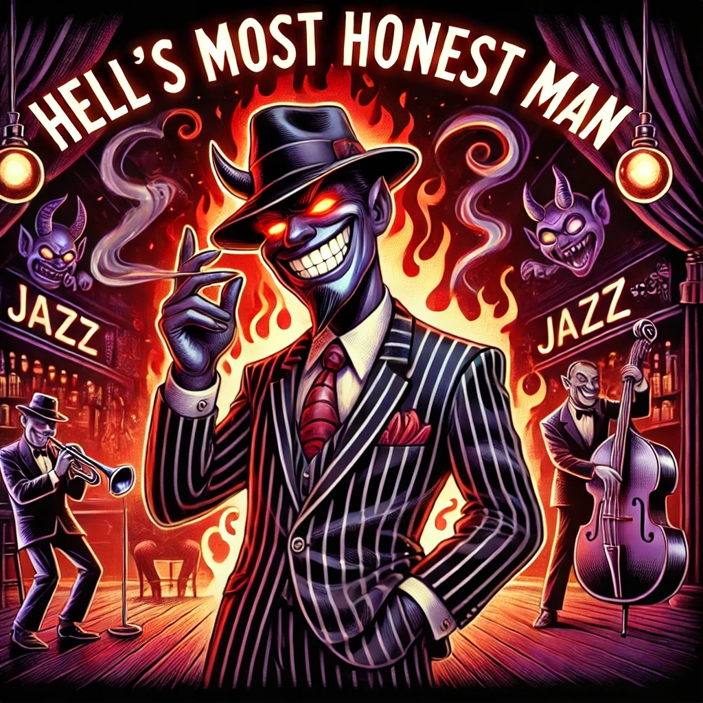 High-energy swing jazz, big band brass, stomping bass, fast rhythm, Playful yet dark, Male lead vocals—raspy, charismatic, theatrical, rich, dynamic, bold, storytelling, full of swagger, sinister, expressive, devil