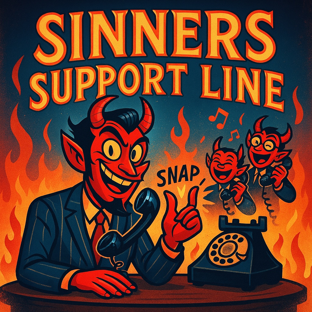Slow gospel swing-boogie with sly, snappy Devil vocals and jazzy imps, Raspy swagger, creeping bass, snapping hats, Playful call-center banter, wild scats, rich harmony, theatrical, expressive, smooth, mocking