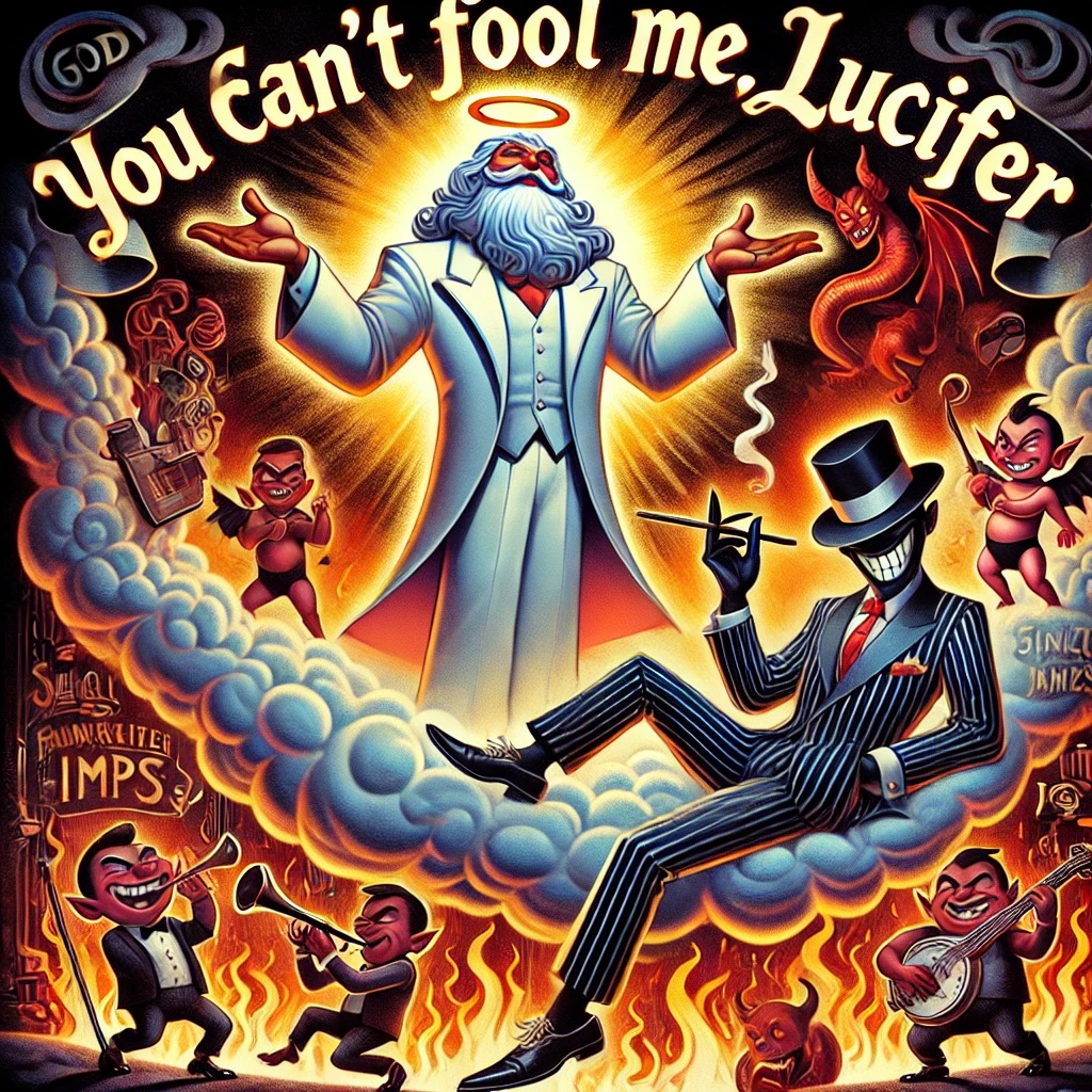 Slow, theatrical gospel swing boogie with sly, raspy, storytelling devilish voice—smooth yet mocking, Swaggering brass, creeping bass, snapping hi-hats, Playful call-and-response, wild scatting, rich vocals