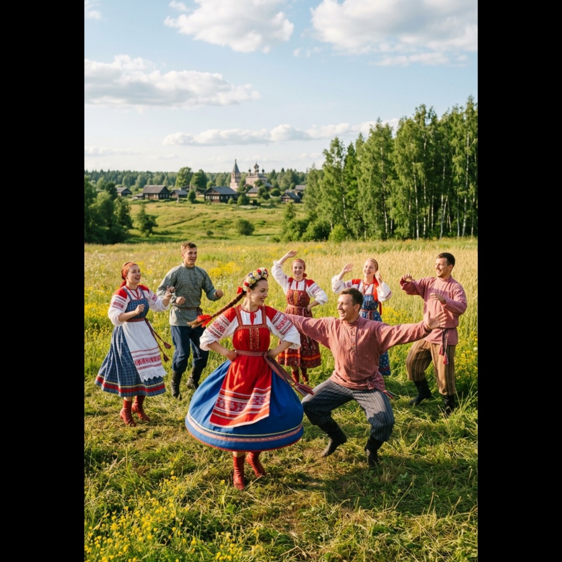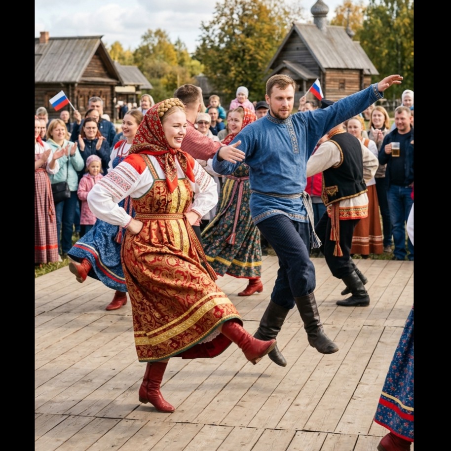 Modern Russian ethno-dance, folk EDM, heavy deep bass, slap house, fat synthesizers, authentic balalaika, svirel flute, cyber-folk, energetic club beat, 3-part harmony choir, epic, Hardbass
