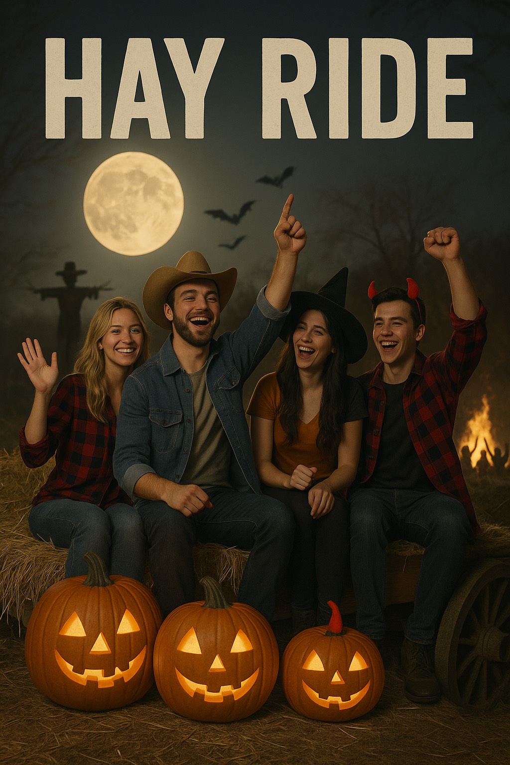 • Acoustic guitar strumming for rhythm, • Electric guitars with a crunchy, festival-rock tone, • Banjo/fiddle accents for country flavor, • Heavy bass + stomps and claps driving the beat, • Big gang vocals layered in the chorus (shout “Hay Ride”!), Vocals / Delivery: