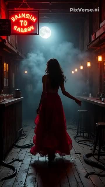 Dark desert rock soundtrack with a hypnotic twangy riff like Tito-& Tarantula’s "After Dark", Deep raspy male vocal sings about a dangerous woman with fire in her lips and smoke in her steps, Whispered hooks ("She moves like sin, "), intense echo and stereo FX, Breaks feature tribal drums, reverse guitar leads, and female laughter, Verses are cinematic, short, and punchy, NLP-style hooks with cliffhangers, distorted transitions, and vocal layers, Final chorus shifts lyrics: “Dancing in the smoke…” Female backing builds tension, Whisper outro: “You saw her too, didn’t you?” → breathy female reply: “You’re not coming back…” Moody, seductive, soundtrack feel, 100% hit energy, Mood: seductive, dangerous, mysterious