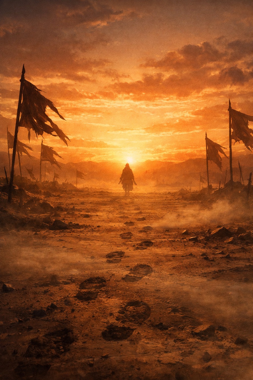 Epic Orchestral Rock, Grand And Majestic Atmosphere, BPM 105-115, Slow But Powerful March Feel, Deep Cinematic Drums, Heavy Taiko Layer, Strong Brass Section (French Horns, Trumpets), Wide And Emotional String Orchestra, Electric Guitar For Subtle Drive (Not Dominant), Choir In Chorus (Male + Female, Heroic And Noble), Male Vocal, Deep, Calm, Charismatic, Very Confident Delivery, No Rush, No Panic, Slight Theatrical Tone, Like A Legendary General Speaking, Structure: