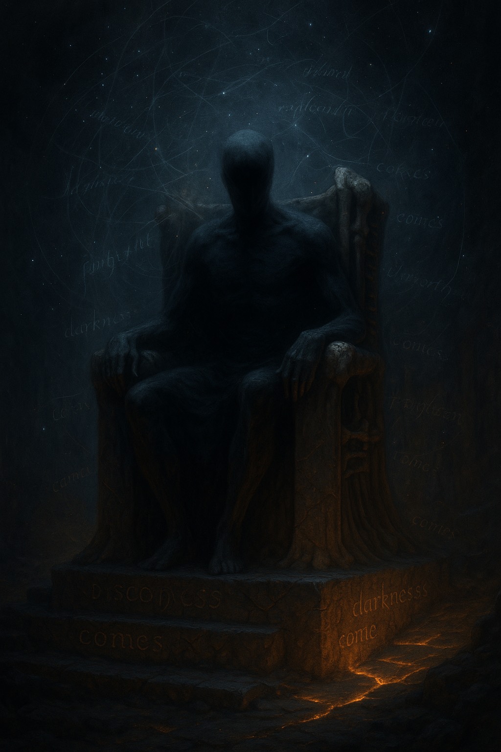 Dark, primal cinematic metal fused with atmospheric gothic ambience, Deep raspy fractured male vocals carry the verses, half-spoken with cracked edges, swelling into rough melodic choruses with layered whispers and faint ritual choirs, Heavy low guitars and ominous bass drive the foundation, while eerie synth textures, dissonant strings, and haunting violin weave through the mix, Dynamic range flows from whisper to roar — bridge unleashes a near-screamed release before collapsing into eerie silence, Tone: ancient, hungry, ritualistic, yet vast and atmospheric, evoking both chaos and inevitability