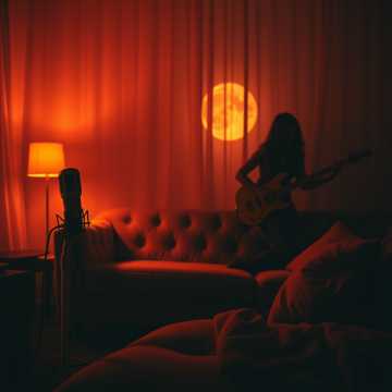 STYLE: SUNBLEACHED CIRCUIT-BOSSA — 60s GIRL-GROUP LOUNGE MELTED INTO PSYCHEDELIC DREAMPOP, PERSONA: PRE-TEEN GIRL VOCALIST, BRIGHT/INNOCENT, RANGE A3–D5, SOFT WHISPER → SPICY FALSETTO, PG BREATH NOISES, MOOD: WISTFUL, DREAD-TINTED, HALLUCINATORY BUT SWEET, TEMPO: 98–106 BPM SWAY, ENERGY SLOW-BUILD TO RUSH, KEY FEEL: A MAJOR WITH MICROTONAL BENDS, TUNING: HARD DETUNE, RADIO NOISE TEXTURE (INSTRUMENTAL ONLY), INSTRUMENTS: MUTED GUITAR, NYLON GUITAR FINGERSTYLE, WALKING UPRIGHT BASS, BRUSHED KIT + CROSS-STICK, TINY CONGAS, SHAKER, MELLOTRON/FLUTE HOOKS, CELESTA GLINTS, VIBRAPHONE WARBLE, OUT-OF-TUNE PARLOR PIANO, SUB DRONE, BROKEN STRINGS, TAPE-DRONE, TUNING RADIO, FX: TAPE WOW/FLUTTER, BITCRUSH, GRANULAR ECHO, REVERSE SWELLS, HUGE PLATE (INSTRUMENTS), NO HARMONIES, NO DOUBLES; CLEAR DICTION; LIGHT DE-ESS; SHORT PLATE/LOW WET, MIX: CENTERED LEAD, WIDE INSTRUMENT HOOKS, SOFT SIDECHAIN TO KICK, TAPE WARMT