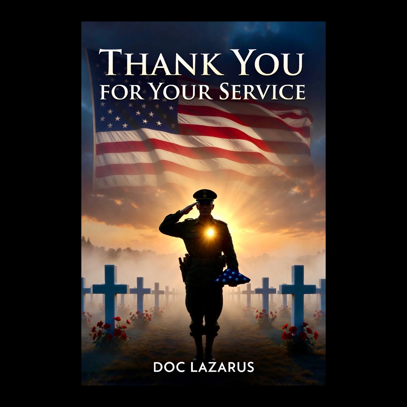 A cinematic patriotic rock anthem honoring veterans and fallen heroes, Powerful male lead (Doc Lazarus) delivers gritty verses from a soldier’s perspective, joined by a strong melodic female vocal (Lady Marie) representing the nation’s gratitude, Slow emotional build with acoustic intro, rising into full electric guitars, drums, and orchestral strings in the final chorus, Tone: reverent, unifying, and heartfelt — blending solemn reflection with proud resolve, Ends with a soft vocal echo and sustained guitar chord fading into silence, SLIDERS: