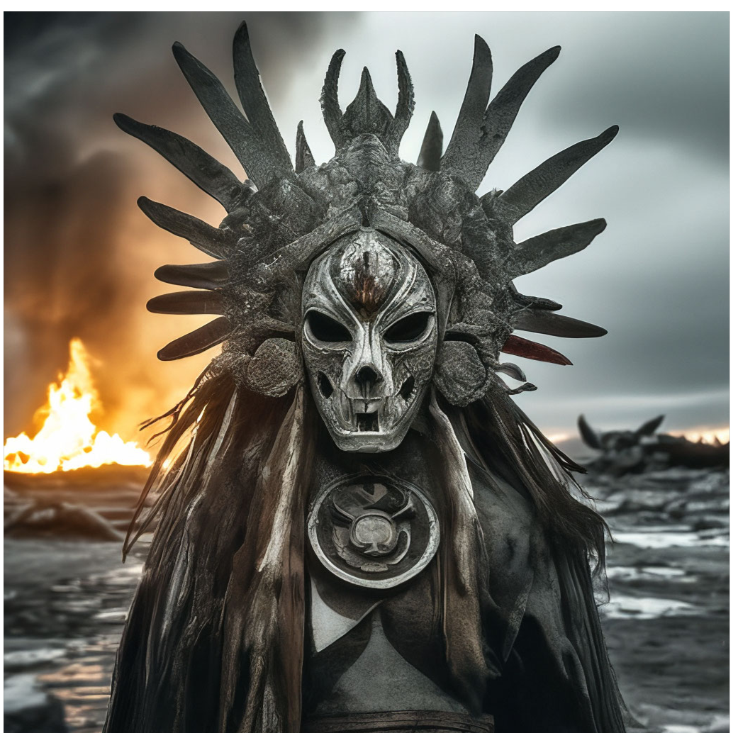 Male vocal, dark folk ritual, Norwegian instruments, shamanic drums, 3 verses with dramatic pauses ("No, ", "Prattle"), instrumental breaks, dark atmospheric outro, 72 BPM
