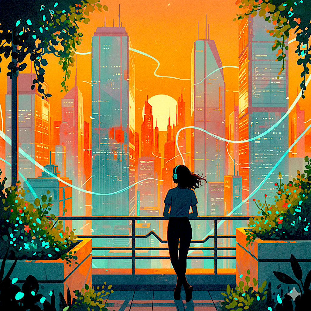 A bright, introspective synthwave-lofi chill fusion with soft Kora motifs and warm analog pads, Around 94 BPM in A major, it flows like a peaceful day in a bustling city where everything feels effortlessly aligned, Delicate two-note Kora phrases weave between dreamy electric piano chords and smooth lo-fi drums, Gentle vocals deliver poetic verses and a memorable hook: “Drift and breathe, until the world turns free, ” The mood is content, flowing, and quietly uplifting — a song about stillness within motion and the soft illusion of perfect harmony