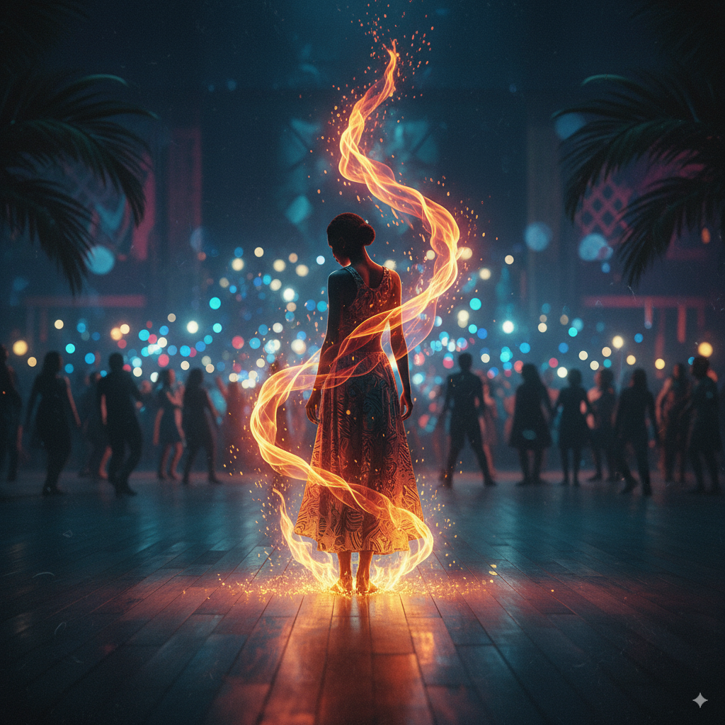 A pop-global fusion track with Afrobeat and reggaetón influences, running about 3 minutes, The song starts light and playful with syncopated percussion and soft tropical synths, then builds with warm basslines, congas, and clap-driven rhythms into a full dance groove, Vocals are melodic, bright, and chant-like, with call-and-response phrasing to create an inclusive, sing-along feel, The mood evolves from gentle encouragement to explosive joy, matching the theme of overcoming shyness and joining the dance, Energy should steadily rise, peaking with a euphoric, festival-ready chorus, Instruments: Afro-Latin percussion, tropical guitars, lush synth pads, crisp electronic polish, and a danceable groove, Emotional tone: uplifting, playful, empowering, universal