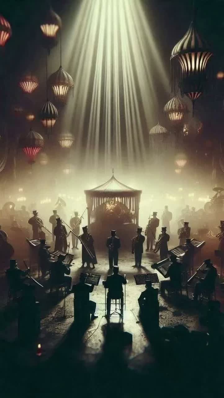 Cinematic dark circus jazz, A haunting fusion of grotesque carnival and noir jazz club, Unpredictable structure, evolving sections, dynamic tension and release, Start minimal (solo piano or distant calliope), gradually layering muted brass, sax, and deep bass, Build into chaotic yet controlled crescendos, then drop back into sparse eerie passages, Include:
