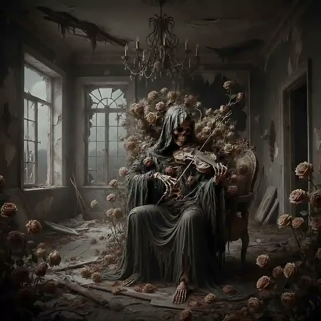 Dark gothic cinematic violin solo in slow 3/4 waltz time, Pure instrumental, no vocals, no drums, Beautiful yet tragic, macabre elegance, Like Death performing a solemn waltz among withered roses in a vast cathedral, Beginning: