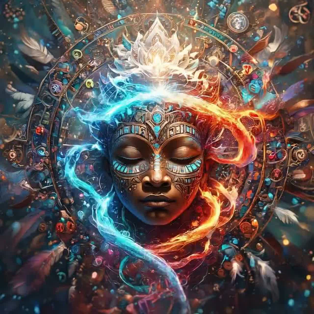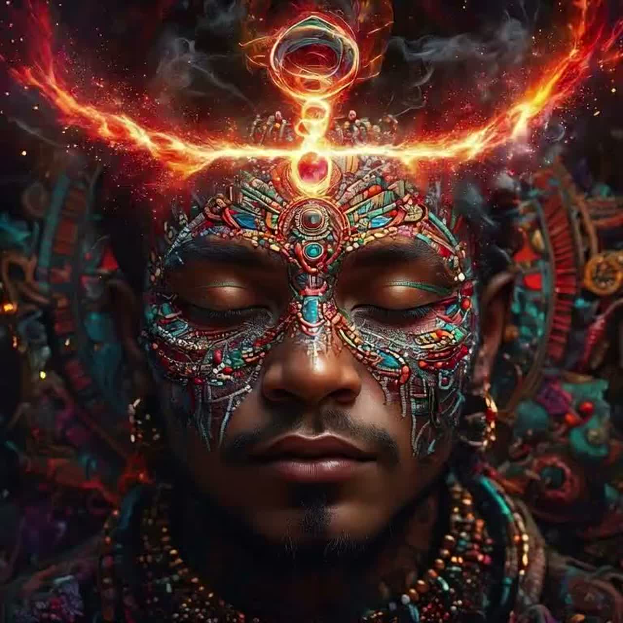 cinematic tribal trance, immersive ritual atmosphere, vast surrounding sound field, deep reverberant space like an ancient ceremony