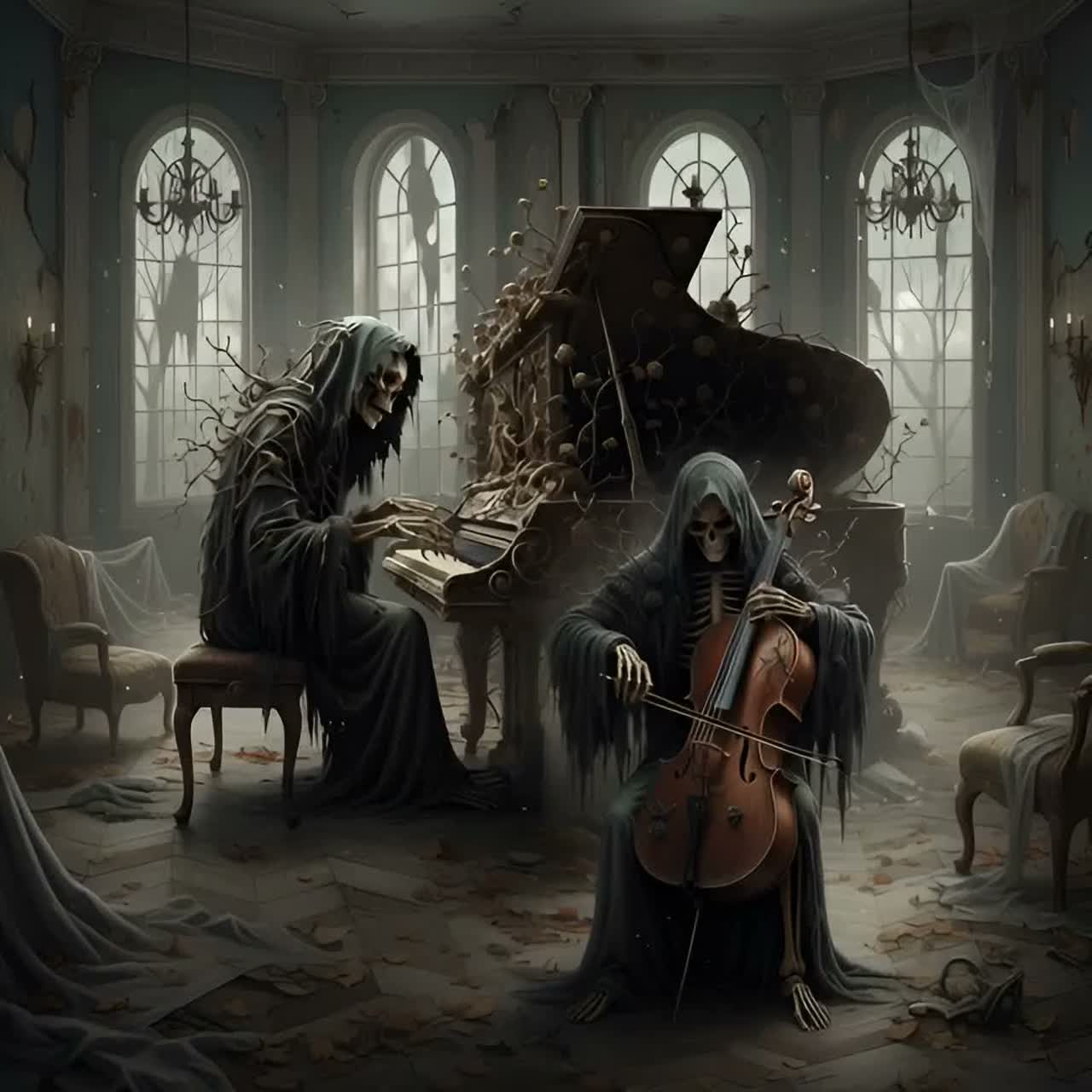 A dark gothic, cinematic cello solo played over a slow 3/4 waltz, A pure instrumental piece with no vocals or drums, Beautiful, tragic, and eerie elegance, It's as if the Grim Reaper is dancing a solemn waltz surrounded by withered roses in a vast cathedral, Beginning: