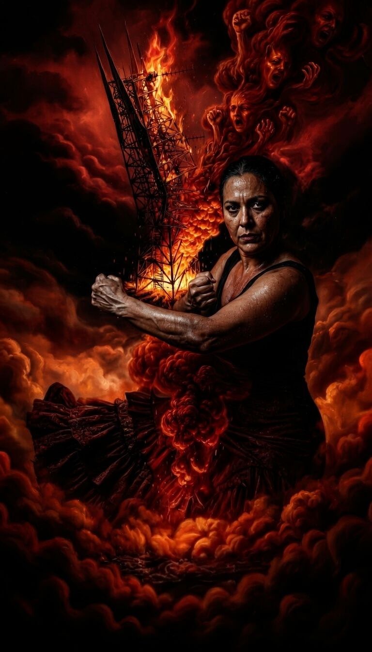 A powerful hypnotic psychedelic rock/post punk/piece with deep agressive mezzo soprano soaring female vocals, hypnotic psychedelic vibes, energetic dark techno drums and basslines, hypnotic death metal guitar riffs, electronic hall effects