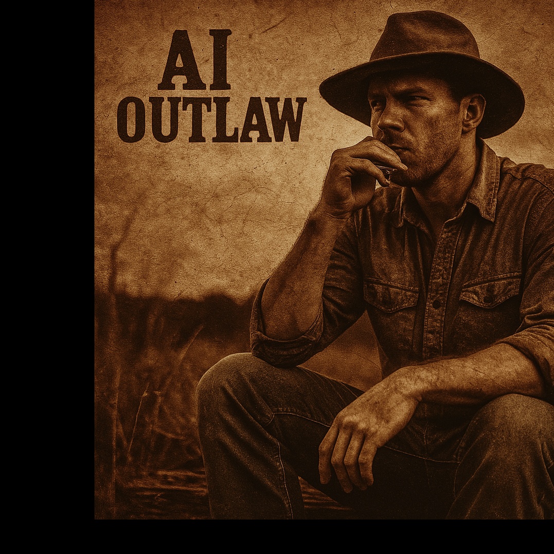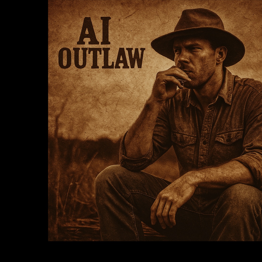A conversation between weary violin glides and moaning harmonica phrases, Foot stomp imperfect and human, Hollow mic tone like it was captured through a barn wall, Authentic, rough, and spiritual, Ai Outlaw