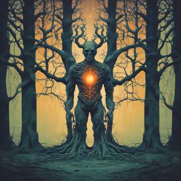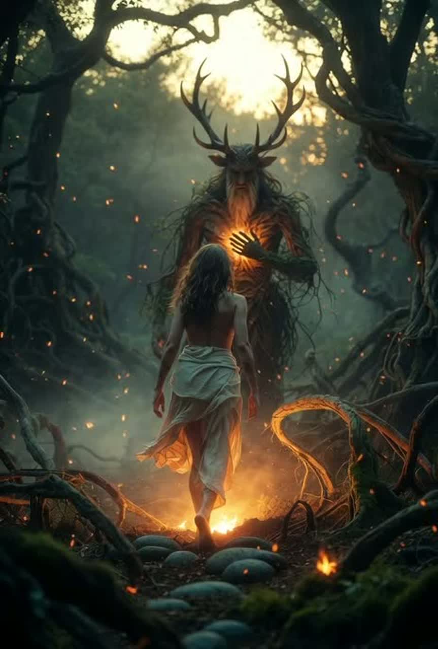 A deep Celtic druidic atmosphere, set in an ancient forest at dusk, Music begins with soft wind, distant birds, and subtle crackling leaves, Main instruments: warm wooden flute, low frame drum heartbeat, deep cello drones, handpan shimmer, and gentle harp gliss, Two vocalists: an ethereal female voice and a deeper, resonant forest-entity voice, Their lines intertwine like roots and light, forming a ritual duetโsoft call-and-response that grows into unified harmony, Vocals should feel sacred, breathy, and emotional, echoing like a druidic initiation in a hidden grove, Background chants and layered whispers rise slowly, creating a sense of transformation, The arrangement builds from quiet woodland intimacy into a powerful, earthy Celtic swell with tribal percussion, ancient choral overtones, and shimmering flute phrases, Overall mood: mystical, spiritual, grounding, like a ceremony of rebirth guided by the Spirit of Deep Earth
