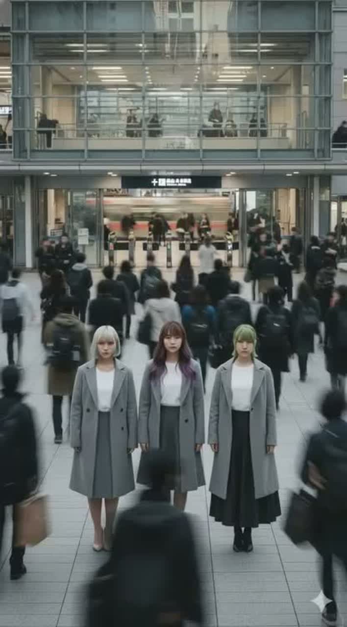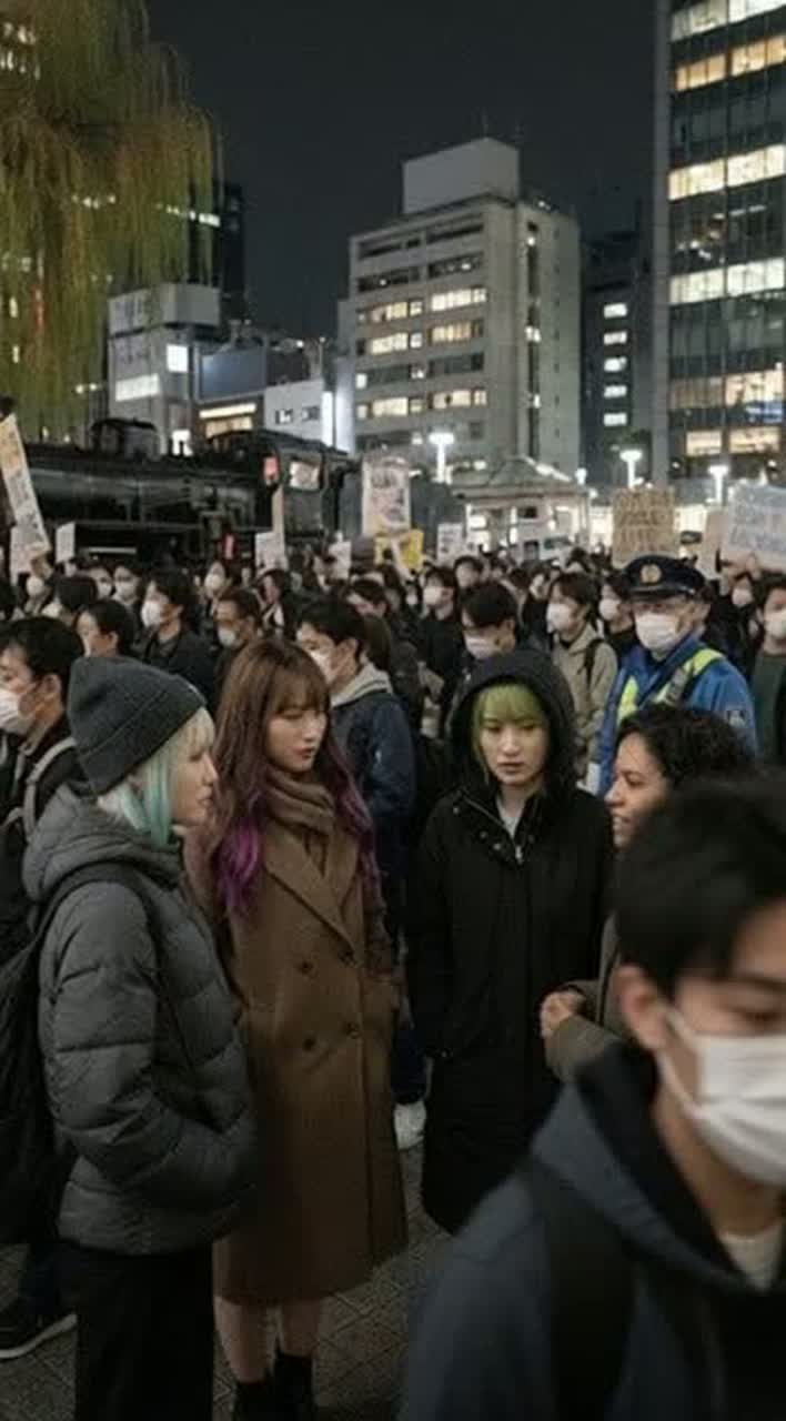 The track launches with ultra-dry electronic drums on a minimal, tense 96bpm beat, A tightly controlled minor-key bass throbs underneath, cut by angular synth stabs, Three young Japanese female voices, untreated and close-mic, interlock in raw, percussive, rhythmic speech, Sparse instrumentation—sharp claps, filtered noise—keeps the relentless, protest-inspired dark EDM energy direct and breathless, all elements intensely close and unembellished, ‑echo reverb scat hamming Asian middle-east pop K-pop rock metal dubstep trap