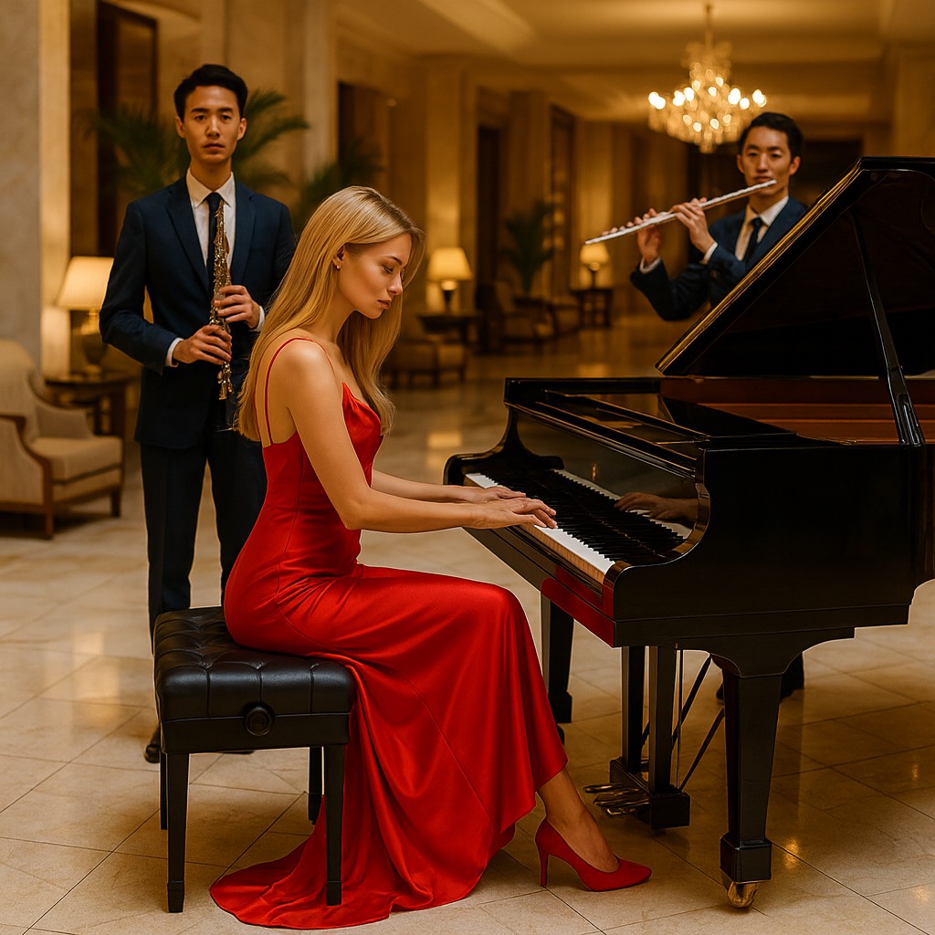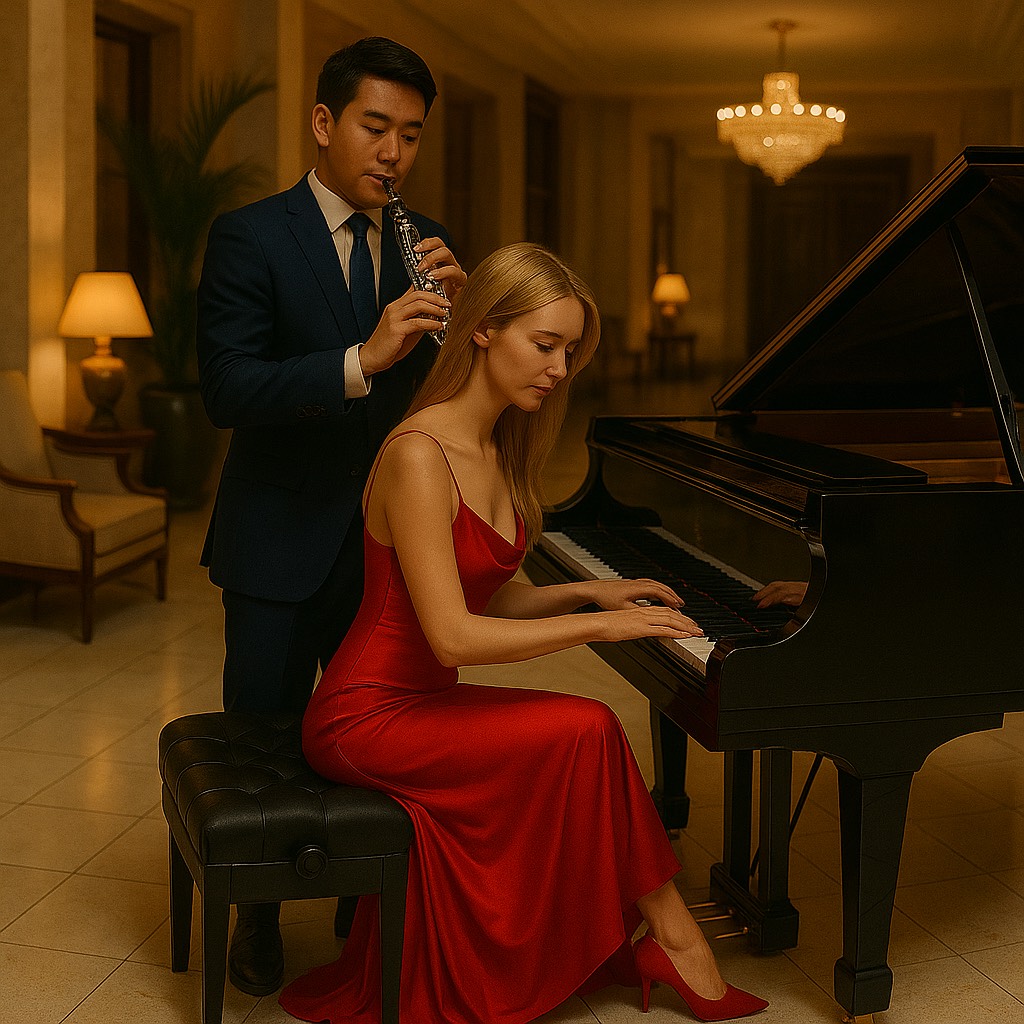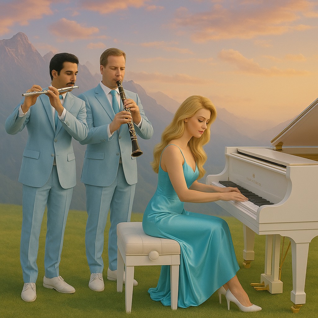 Duett Panflute solistes and Piano virtuoso and minimalism, with the typical Venecian–slow melancholic flair of the nouvelle musique française — modern piano - panflute Duett music with classical influences, featuring repetitive patterns, a simple harmonic structure, and a hypnotic flow, Vibe: slow gentle French chanson melancholy, A repetitive, rhythmic left hand (ostinato), an eternal harmonic melody in the right hand, soft dynamics, almost dreamlike, No excessive virtuosity – the emotional impact comes from simplicity and feeling