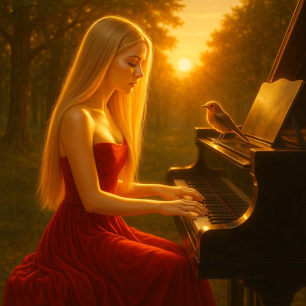 Romantic Slow Grand music and minimalism, with the typical French–slow melancholic flair of the nouvelle musique française — modern piano music with classical influences, featuring repetitive patterns, a simple harmonic structure, and a hypnotic flow, Vibe: slow gentle French chanson melancholy, A repetitive, rhythmic left hand (ostinato), a lyrical, slightly melancholic melody in the right hand, soft dynamics, almost dreamlike, No excessive virtuosity – the emotional impact comes from simplicity and feeling