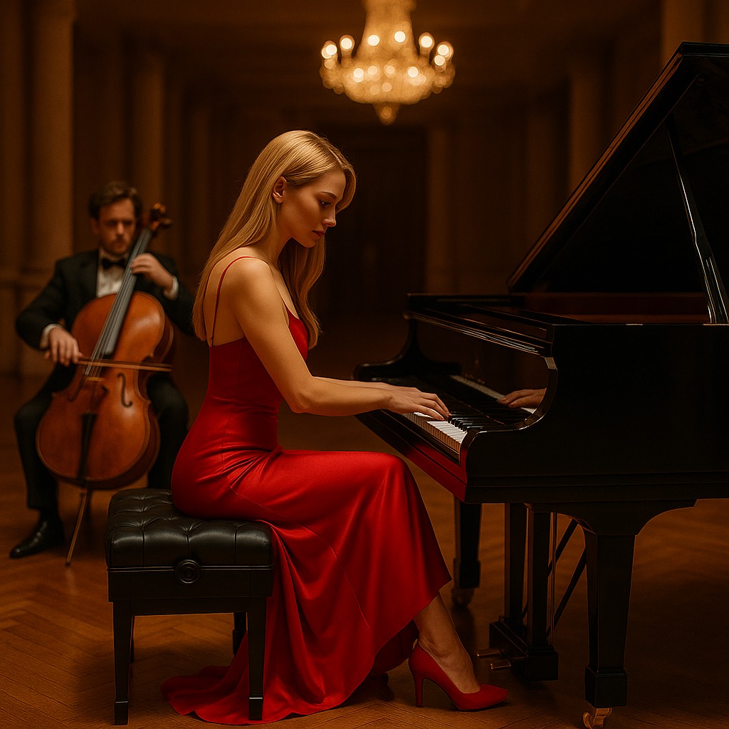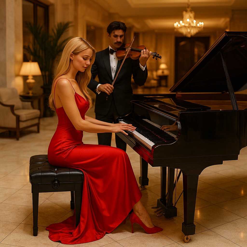 Csardas: Romantic Hungarian gypsy violin virtuoso and Piano music and minimalism, with the typical Hungarian Csardas–fire and passion of Hungarian Csardas — romantic piano music with classical influences, featuring repetitive patterns, a simple harmonic structure, and a hypnotic flow, Vibe: slow gentle Csardas melancholy, A repetitive, rhythmic left hand (ostinato), a lyrical, slightly melancholic melody in the right hand, soft dynamics, almost dreamlike, No excessive virtuosity – the emotional impact comes from simplicity and feeling