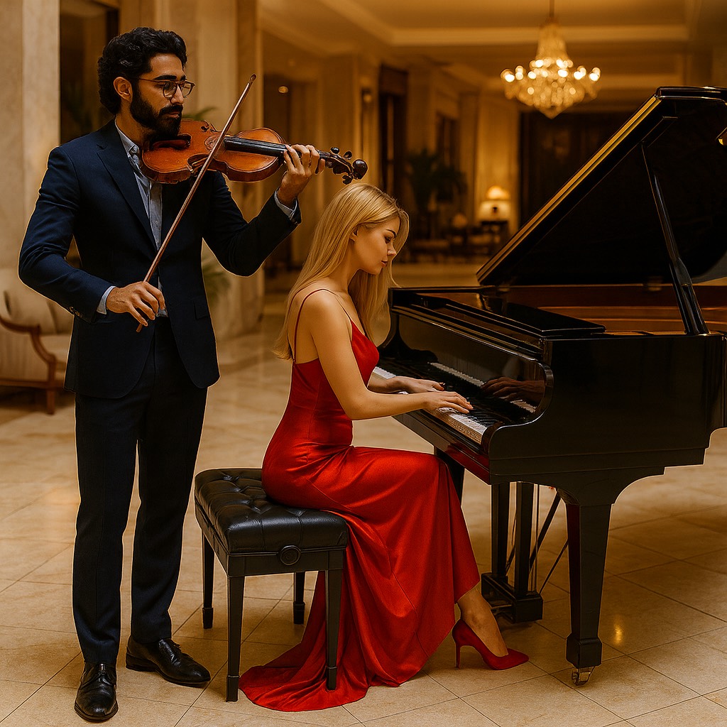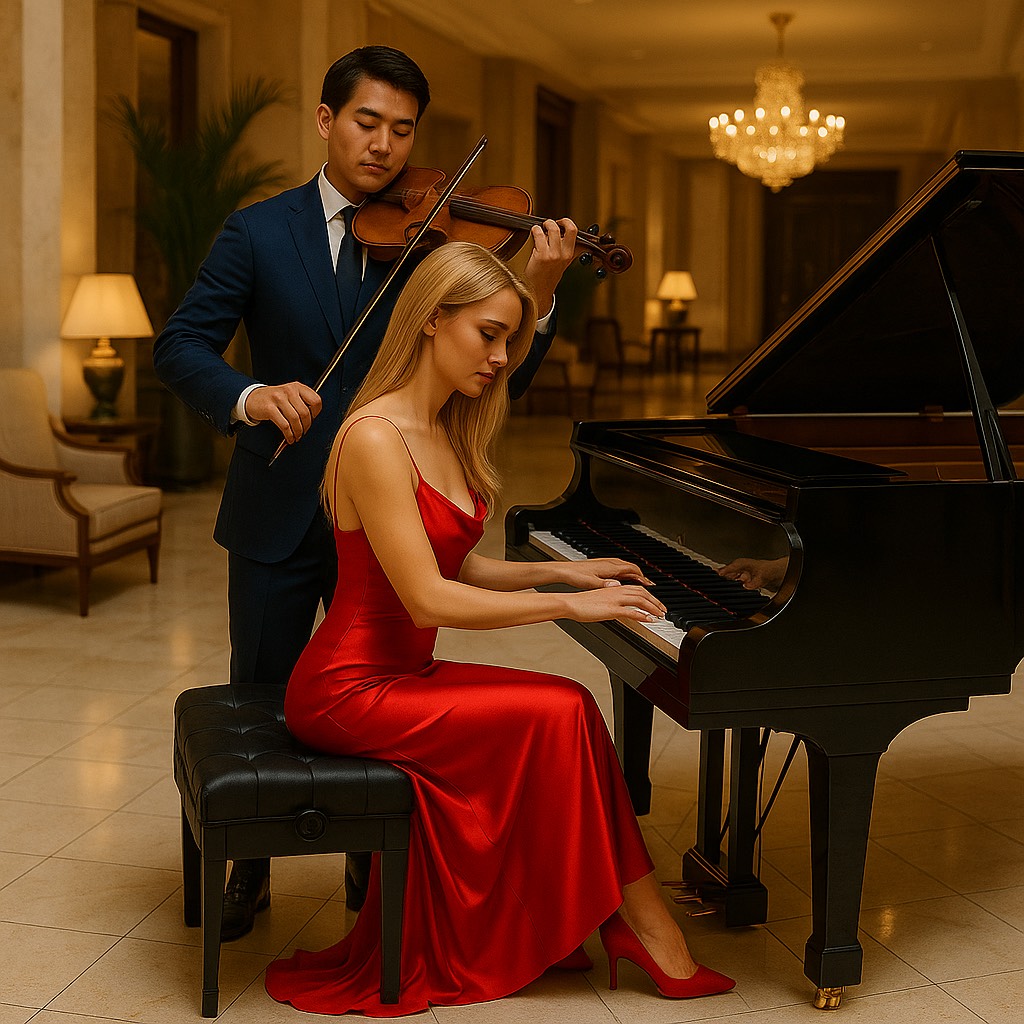 Grand Piano playing a Repetitive slow melody giving steady constant slow rhythms with left hand, expressive emotional violin virtuoso playing a melody expressing romantic angelic heavenly ethereal “call of an angel”