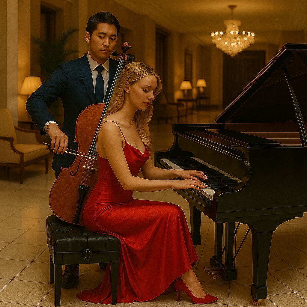Classical romantic melody of a dialogue of cello declaring his eternal love to thi beautiful piccolo flute accompanied by Grand Piano in a repetitive calming steady rhythm