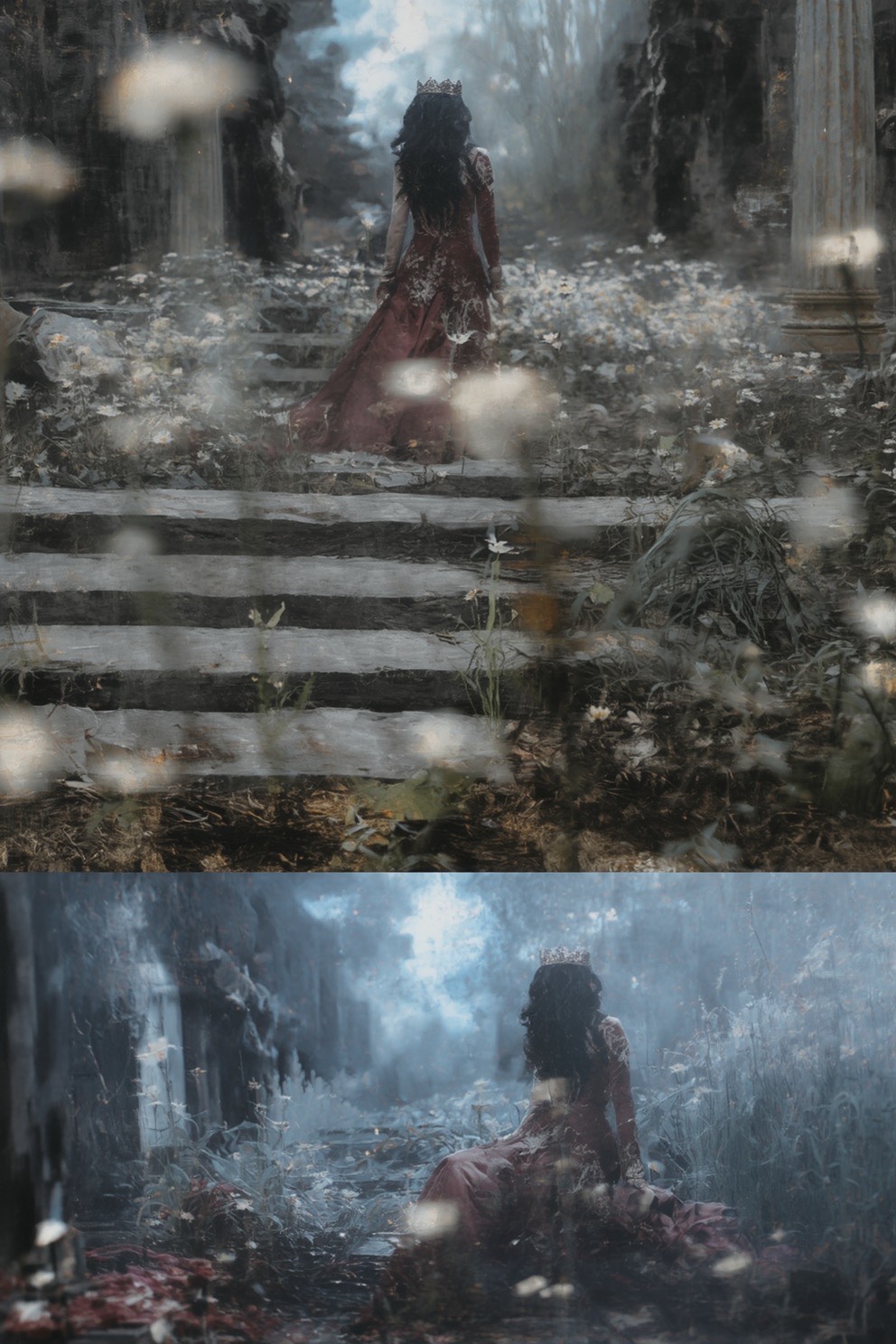 Verse: minor key (A minor), delicate harpsichord notes, cello sustains, • Chorus: rising emotional swell, layered vocals, echoing reverb, • Bridge: whispered tone with soft strings — then dissolve back into the chorus, • Overall mood: tragic love remembered at midnight, as if she’s singing to a lover long gone but still haunting her silk-draped room