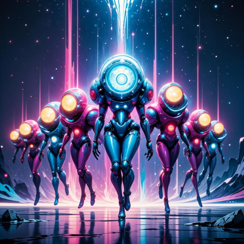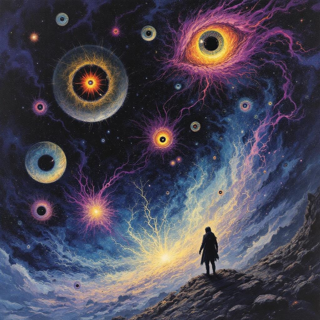 Ambient cosmic trance, slow and expansive, 90–110 BPM, Deep sub-bass drones like distant gravity wells, Evolving pads that swell and recede like nebula clouds breathing, High-frequency crackle and lightning-like synth filaments that arc across the stereo field, Sparse, delayed pulses instead of drums — heartbeat slowed by scale, Tonal center: D minor or F Phrygian, unresolved, circling, Occasional distant choral tones or vowel drones (non-lyrical), as if the universe is observing, Long reverb tails, heavy space, negative space respected, No aggressive drops — energy rises through density, not volume, Mood: awe, insignificance, wonder, quiet dread, acceptance, Feels like standing on the edge of reality while something vast looks back, unsettling, eerie