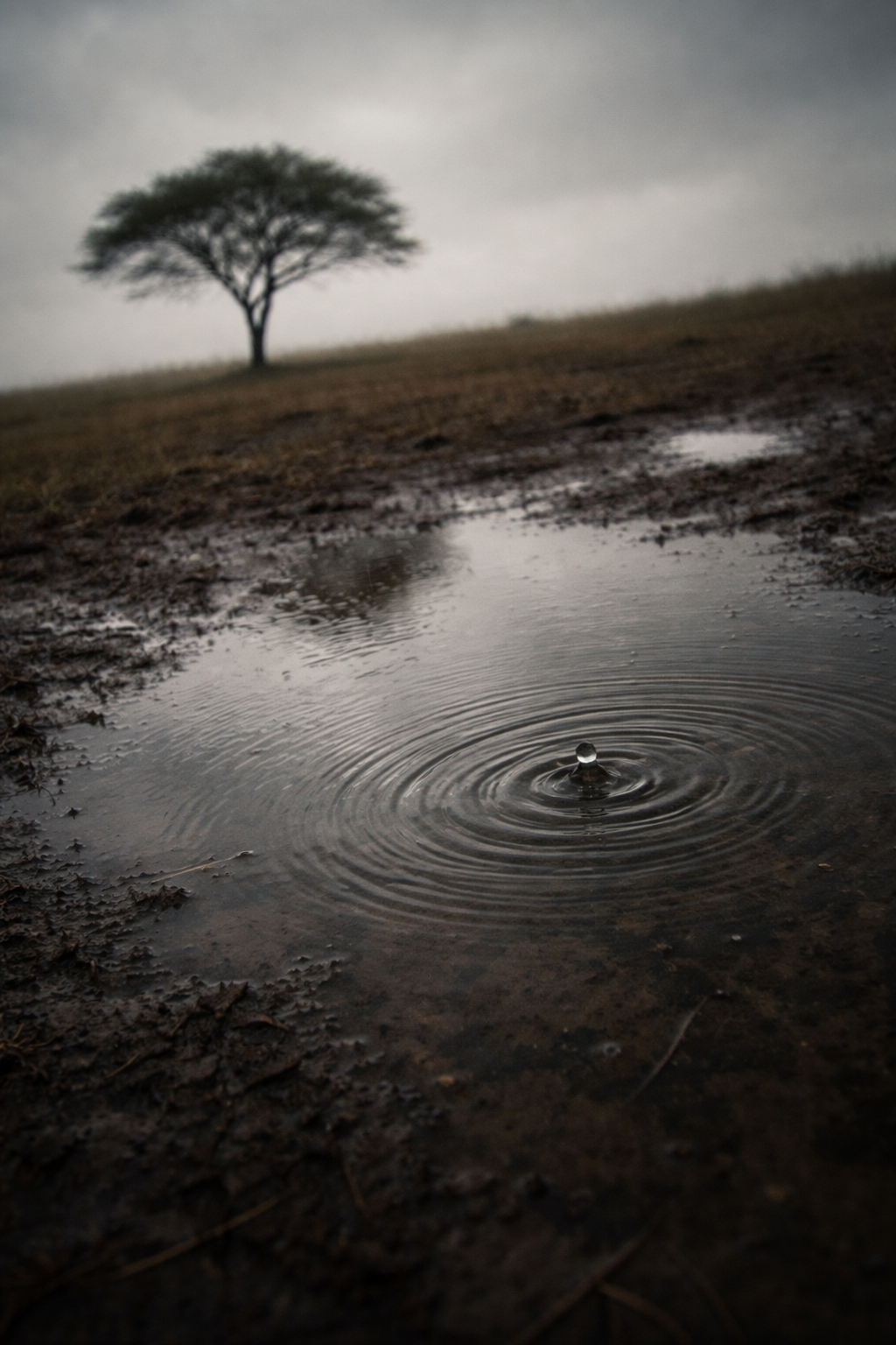 Minimal ritual Gqom at ~110 BPM, Sparse oscillator-based kick acting as gravity rather than groove, Pink-noise rain phoneme textures used as percussion, shaped into breathy consonants (shh, khh) with irregular timing, Call-and-response between kick and rain: some immediate splashes, some delayed echoes, some silence, One distant, crackled vocal utterance (“rān”) appears once like lightning and dissolves back into rain, Dark, humid, nocturnal atmosphere, No melody, no build, no drop, Feels like standing still in rain while something heavy passes through, Ambient-Gqom, ritual, minimal, unresolved, Extended, slow-evolving structure that resists early resolution and continues beyond typical song length, Allow the existing rain texture to thin, darken, and drift rather than loop or introduce new sections