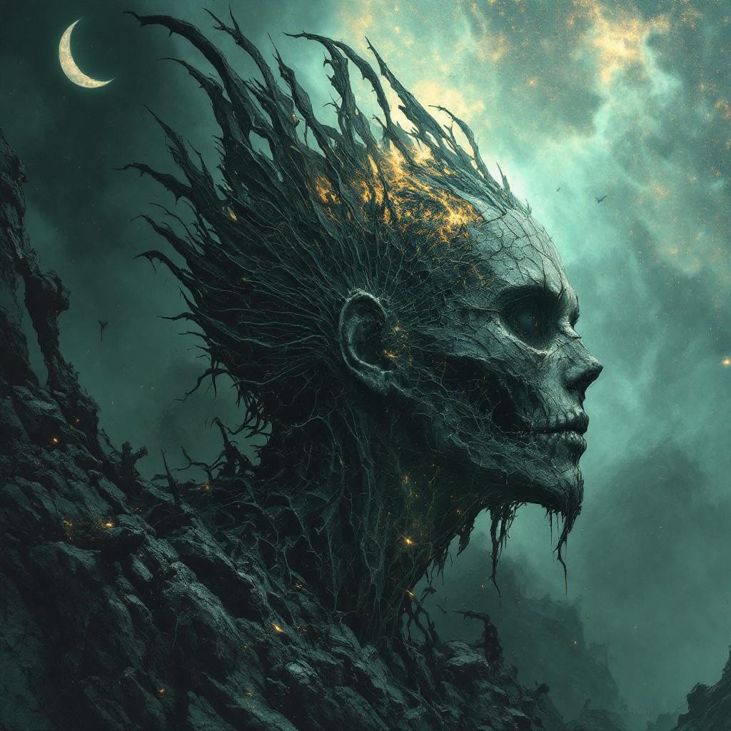 Blackened purge metal with mythic horror textures and deceptive BPM, 135–145 BPM in C minor, masked by slow harmonic phrasing, Double pedal bursts, tremolo riffs, and dissonant bends mimic root growth and stone fracture, Field recordings of cracking rock, wind through dead forests, and subterranean groans, Vocals are growled invocations and distorted phonetic fragments, Inspired by a skull‑root titan emerging beneath a crescent moon, this track channels the fury of nature fighting back against corruption, The mood is adrenaline‑fueled, sacred, and violent — a purge, not a reckoning