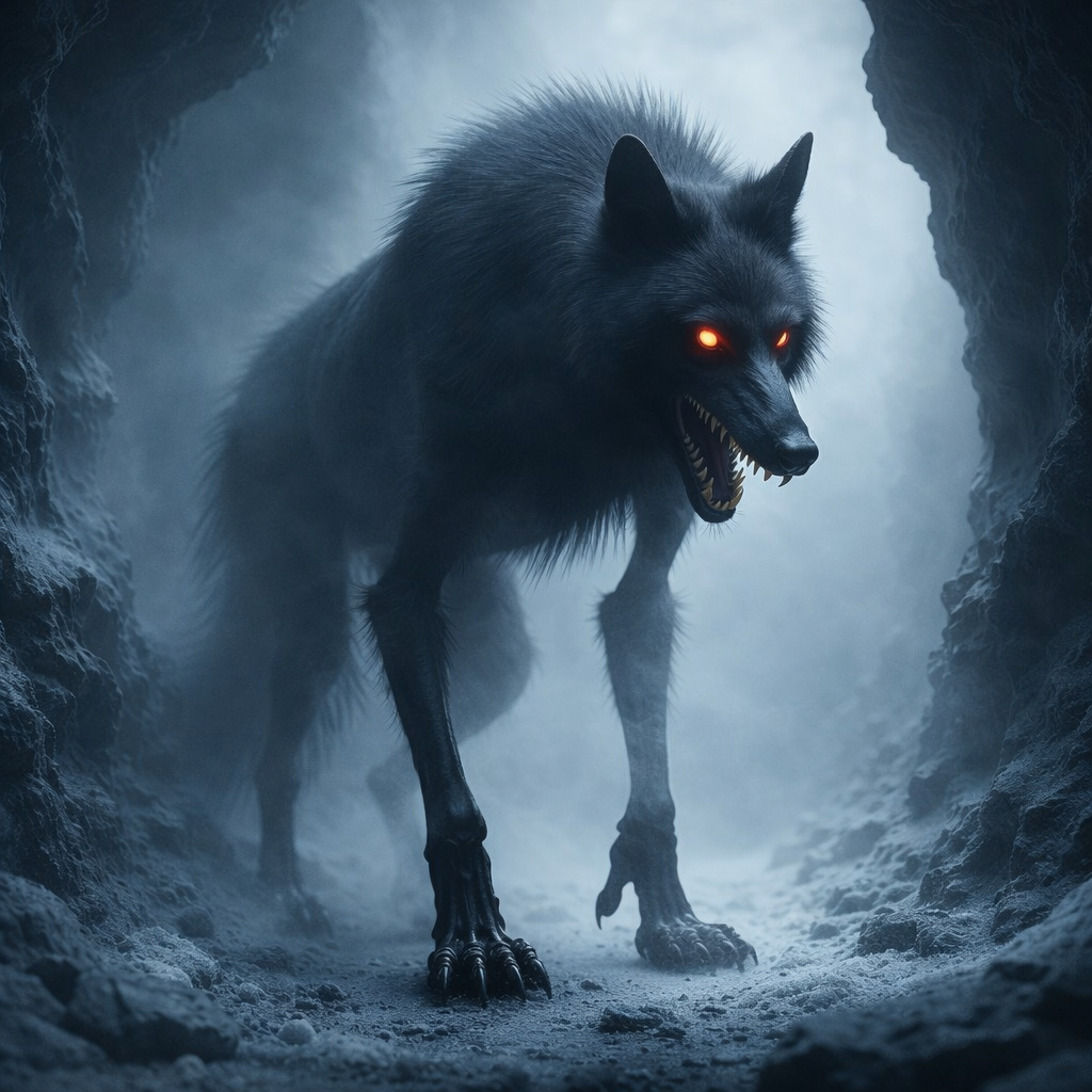 Animals as Leaders–inspired instrumental complexity fused with mythic horror vocals, Polyrhythmic 8‑string djent riffs, displaced snare patterns, and metric modulations that create a stalking, predatory groove, Guitars use staccato low‑end pulses, tapping motifs, and sudden harmonic shifts (Lydian → Phrygian → Locrian), Drums emphasize polymeter deception with ghost‑note riddles and heartbeat‑like kick patterns, Atmosphere includes reversed whispers, sub‑bass growls, glitch breaths, and distant processed howls, Tone is predatory, intelligent, and inevitable