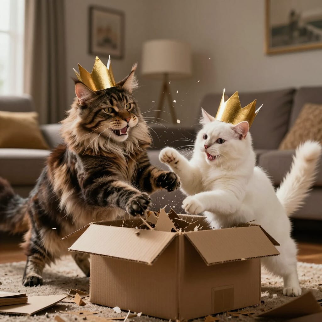 Playful hyperpop-inspired upbeat pop with light K-pop structure, Fast energetic beat with glitchy transitions and tempo fake-outs, Bright distorted synth leads with pitch shifts, Rubber-like bouncy bass with slides and sudden drops, Punchy electronic drums with aggressive clap accents and chaotic fill-ins, Cute but slightly chaotic cartoon FX (paper tear, boing, laser zaps, reversed meows), Pre-chorus builds with layered noise risers and fake drop before explosive chorus, Cheerful female vocal with playful but slightly manic attitude, Occasional rhythmic chant or group shout layers, Bridge shifts into dreamy lo-fi sparkle moment before glitch explosion, Theatrical, colorful, unpredictable and addictive energy, Feels like a cat battle inside a neon arcade kingdom