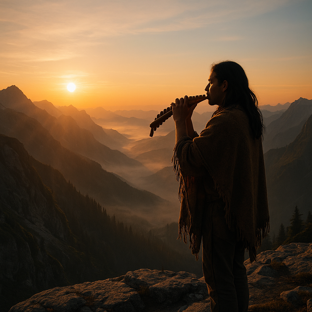 Intro: Solo pan flute with soft ambient drones, Build: Strings and percussion enter, pan flute remains central, Climax: Full orchestral backing with pan flute soaring above in layered harmonies, Outro: Gentle return to solo pan flute, fading into silence, Imagery: Winds flowing across mountain peaks, sunrise over valleys, voices of ancestors echoing through the stones and skies