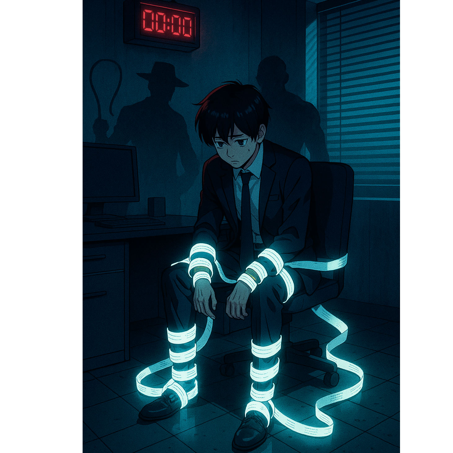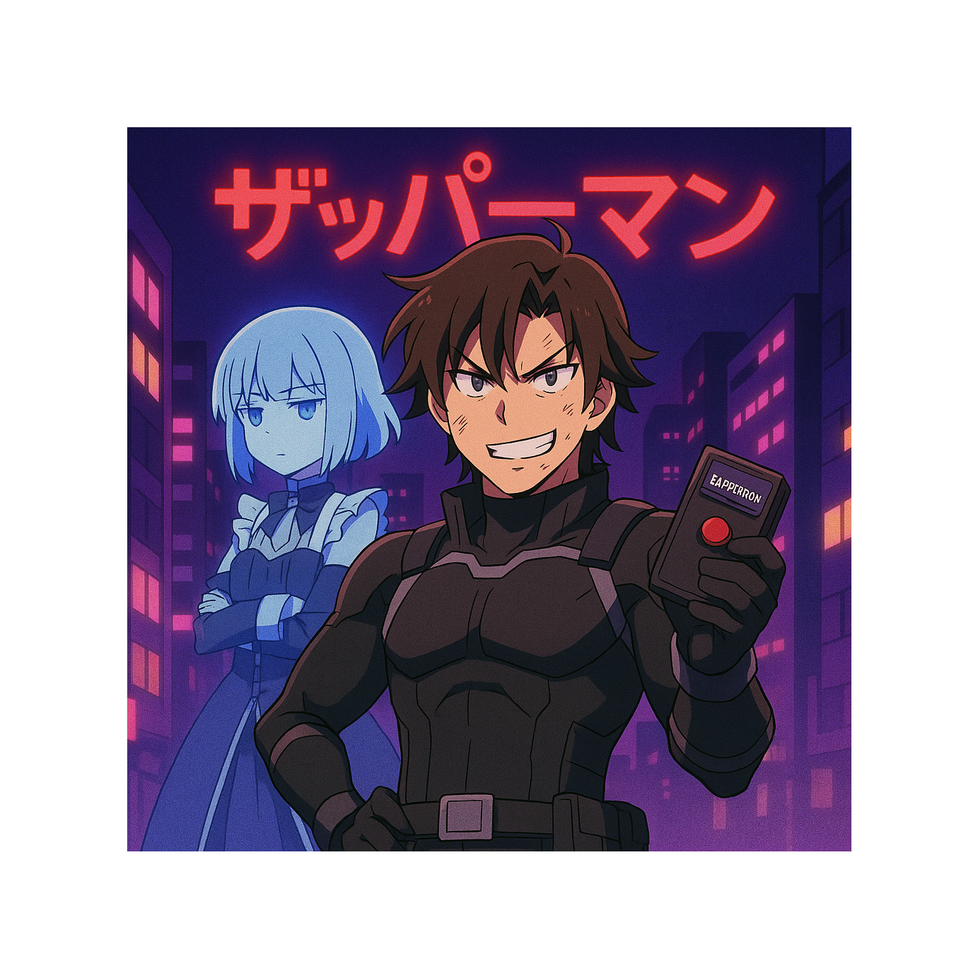 Japanese Phonk × Lofi fusion, Dark, dreamy, nocturnal, ironic mood, Deep 808 bass with Memphis-style phonk drums, swung and groovy, Soft lofi Rhodes keys, atmospheric pads, subtle vinyl crackle, Background ambience: faint Japanese night bar sounds (clinking glasses, distant chatter, cicadas), Tempo ~85 BPM, Vocaloid ethereal hook with chopped & reverbed effect, Distorted ad-lib shouts: “ZAPPERMAN!” echoing, Vibe: sarcastic anti-hero’s daily routine, mixing humor with melancholy
