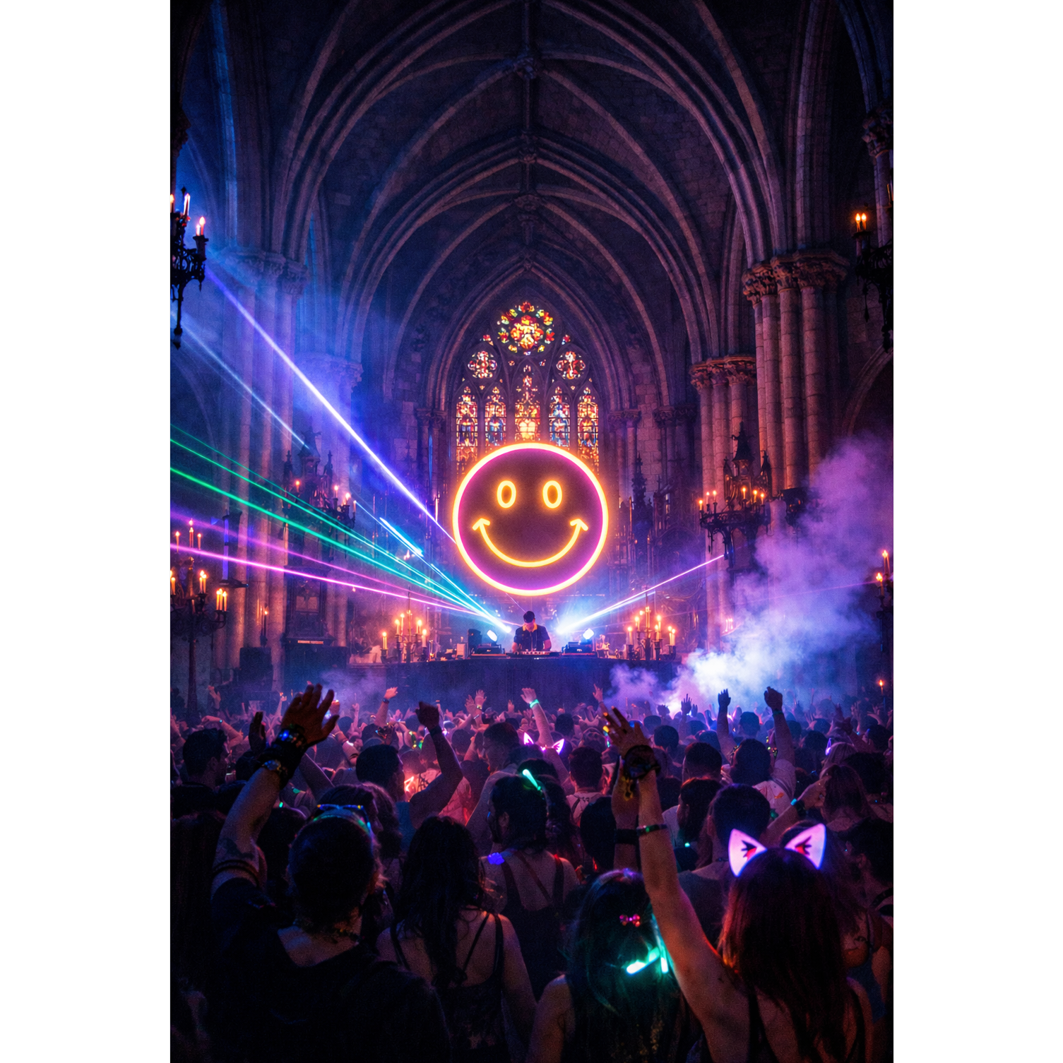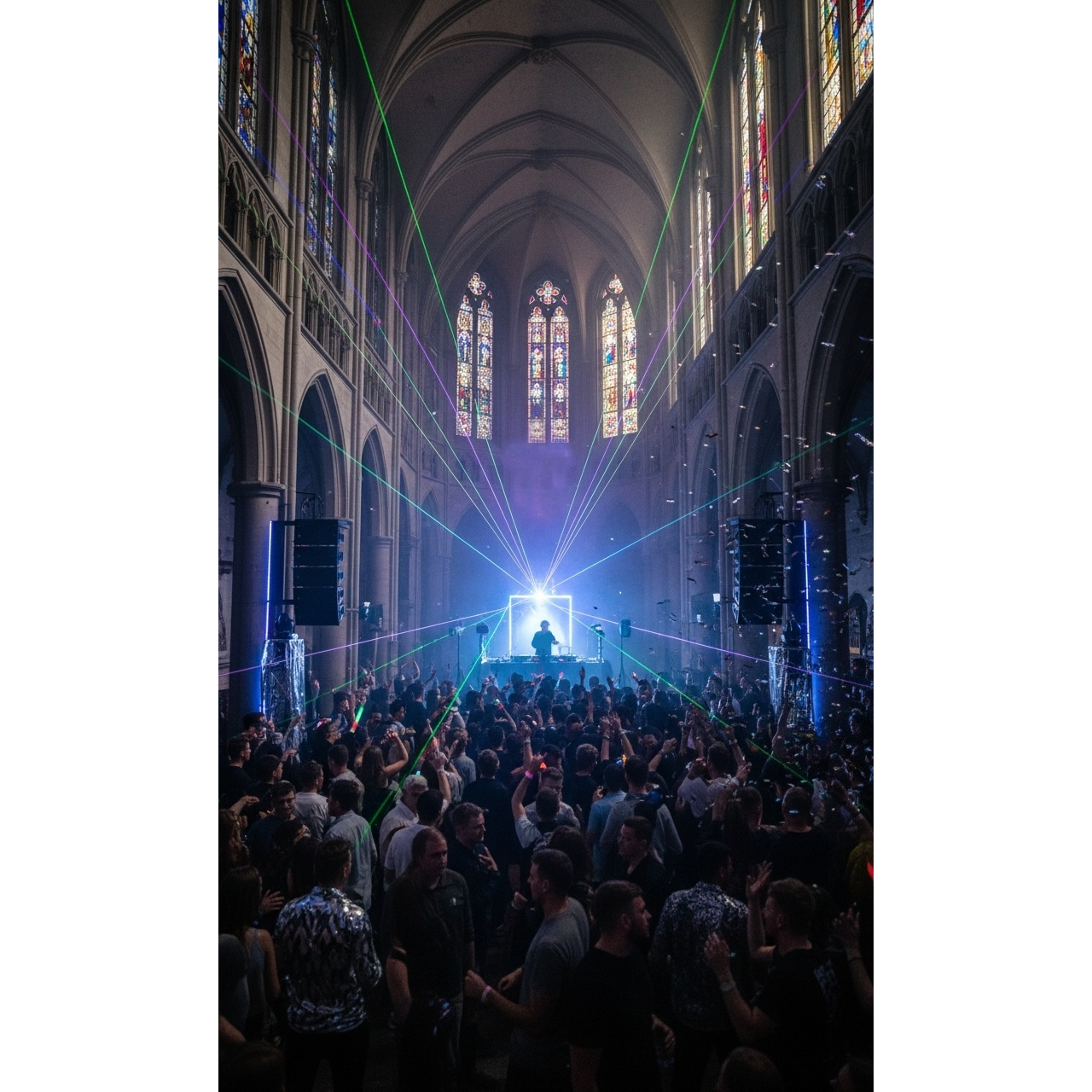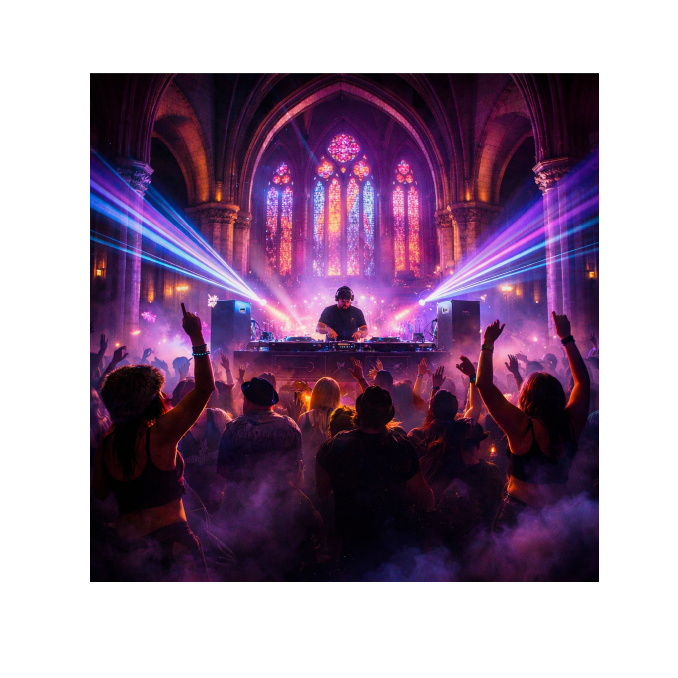 High-energy Christian electronic dance music track blending elements of hardstyle, big room house, and dubstep, The song features aggressive, distorted kick drums characteristic of hardstyle, paired with rapid-fire synth stabs and heavy sub-bass drops, The tempo is approximately 150 BPM, Vocal samples are heavily processed with pitch-shifting, stutter effects, and reverb, alternating between rhythmic chants and melodic hooks, The structure includes high-tension builds with rising snare rolls and synth oscillators, leading into explosive drops with metallic, screeching lead synths, Production is polished with wide stereo imaging, sidechain compression on the bass, and crisp high-end percussion, The harmonic content is centered around a minor key, utilizing dark, driving chord progressions to create an intense, anthemic atmosphere