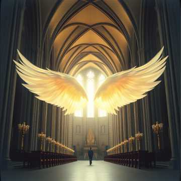 Inside a grand medieval cathedral at dawn, a majestic Gregorian choir of deep male voices sings in rich Latin harmonies, slow and solemn tempo, The sound resonates with long natural reverb from towering stone walls, In the distance, large bronze church bells toll slowly, their warm overtones blending with the chant, Ambient background: faint wind whistling through high stained-glass windows, soft echoes of footsteps on marble floors, occasional creak of wooden pews