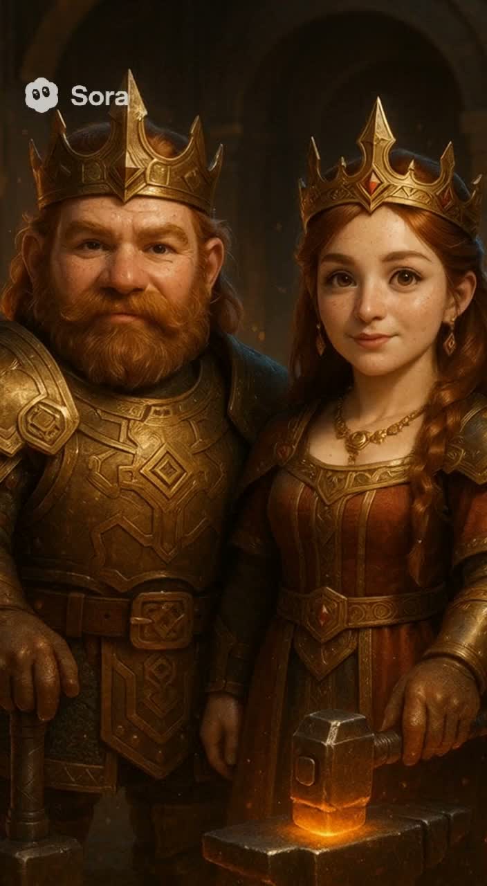 Dwarven War Duet — two voices born in thunder, steel, and avalanche fire, Genre: High-Speed Mountain Metal × Industrial × War Anthem; furious, molten, unstoppable, Tempo 130–160 BPM (Mine Blitz), Tonality: Phrygian minor with iron resonance and lava-edge guitar, Instruments: hammer-on-anvil, blast drums, double-kick pedal, steel plate crash, pickaxe strikes, molten riff guitar, chain whip, bass hammer, furnace roar, stone horn blare, crowd chant “Khazâd!”, Male vocal – deep roar, mountain-king growl with war snarl, Female vocal – razor alto belt, feral shout through sparks, Duet – rapid alternating verses, unison battle chorus, Rhythm: hammer-triplet (3+3+2) × double-kick drive, Structure: intro (rock eruption) → verse (mine onslaught) → pre (lava surge) → chorus (iron uprising) → bridge (guitar meltdown + drum fury) → final chorus → outro (cave collapse), Production: dry metallic echo, crushing low end, volcanic compression, blast-forge mix, Atmosphere: sweat, flame, rock, steel —