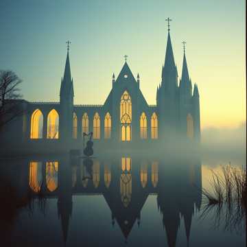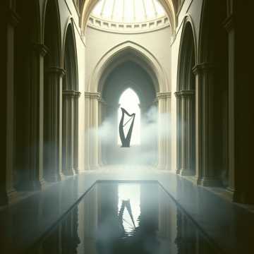 Epic high fantasy orchestral soundtrack inspired by ancient worlds, Slow tempo, modal harmony, haunting and reverent, Ethereal choir singing in a fictional language, Deep strings, French horns, sparse percussion, Minimal melody, long sustained notes, Massive reverb, cathedral-like space, Melancholic, sacred, timeless, quietly hopeful, Gradual build, then a soft, fading ending