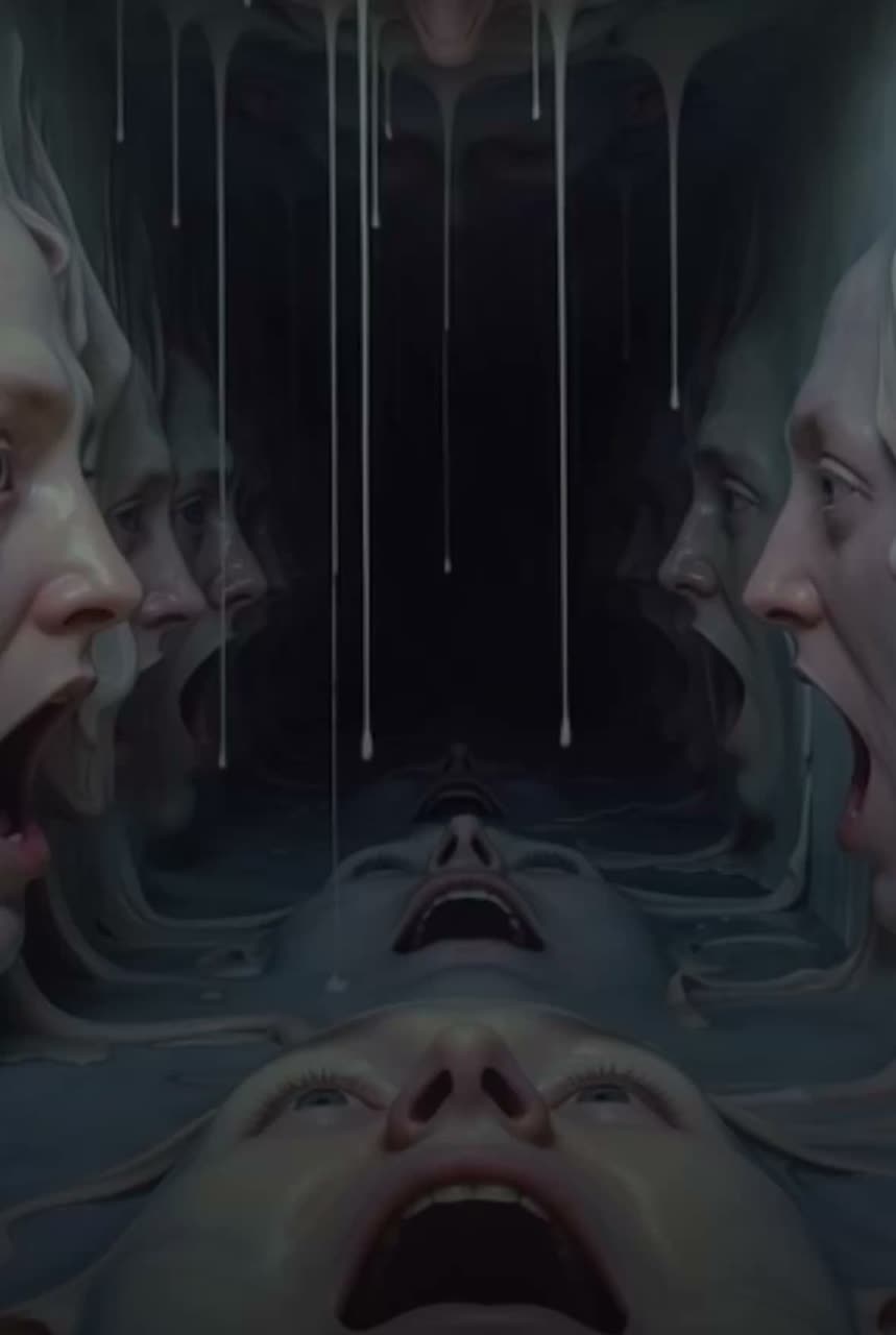 half-spoken, half-moaned—triggering trance, Synths growl downward in glitchy trails, Horror FX