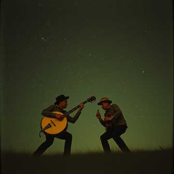 Appalachian Bluegrass Fusion + Dueling Banjos + Folk Jam, 124 BPM, G major, two clawhammer banjos in call-and-response lead/backup rotation, upright bass rhythmic walking foundation, brushed snare + stomp board backbeat, fiddle counter-melodies and slide fills, resonator guitar occasional accents, mandolin chop rhythm syncopation, warm ribbon mic capture with light tape saturation, mid-side stereo width on banjos, subtle plate reverb for natural room presence, dynamic swells through progressive intensity, fast rolls and melodic runs alternating between instruments, rhythmic breaks and trading licks for competitive energy, crescendo to ensemble finale with sharp double-stop accents