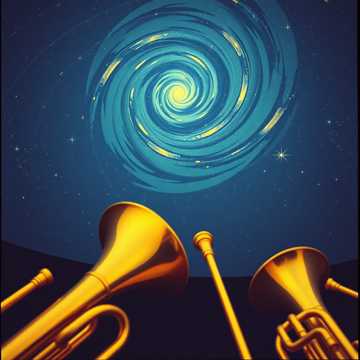 Epic orchestral theme inspired by cosmic exploration, The music launches with trombones blazing in a bold, brassy fanfare, joined by trumpets for brilliant bursts of heroic light, French horns follow, soaring with noble, arching lines that speak of courage and discovery, High woodwinds—flutes and piccolo—flutter and sparkle, evoking weightless starlight, Underneath, vibraphone and celeste add shimmering resonance, while harp glissandi sweep upward like radiant beams across the cosmos, Percussion drives intensity: snares rattling with anticipation, cymbals crashing like meteors, timpani rolling with thunderous gravity, Strings broaden the landscape, violins and violas sweeping through lush harmonies that anchor the grandeur, Hovering above, a theremin-like voice bends and glides, eerie yet beautiful, conjuring the mystery of the unknown, The mood is triumphant, vast, and otherworldly, blending majesty and strangeness into a timeless anthem of interstellar wonder