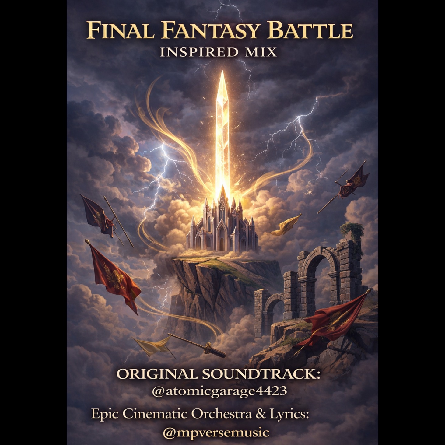 Epic orchestral fantasy battle music, inspired by Japanese RPG and Final Fantasy style, soaring strings, powerful brass, layered percussion driving fast tempo, heroic cinematic, woodwind flourishes, harp arpeggios, bold electric guitar riffs, swelling strings, powerful timpani, intense and grand composition, cinematic audiophile Dolby Atmos wide stereo imaging, ultra clean balanced mix, deep sub bass, high dynamic range, tribal swing NAF fusion, flute as primary lead instrument, banjo textures, guzheng, erhu, bamboo flute, ethereal space synth pads, ambient ocean atmosphere, immersive depth, soft expressive flute opening, gradual orchestral build, grand piano arpeggios, rising synth layers, war symphony progression, loud deep bass drums, marching percussion, aggressive controlled cinematic impact, wide brass layers, choir support, clear instrument separation, dynamic rise and fall, final fade out, single lone flute ending, long reverb tail, cinematic emotional finish, male vocals