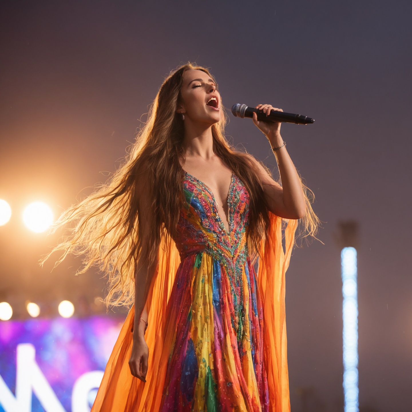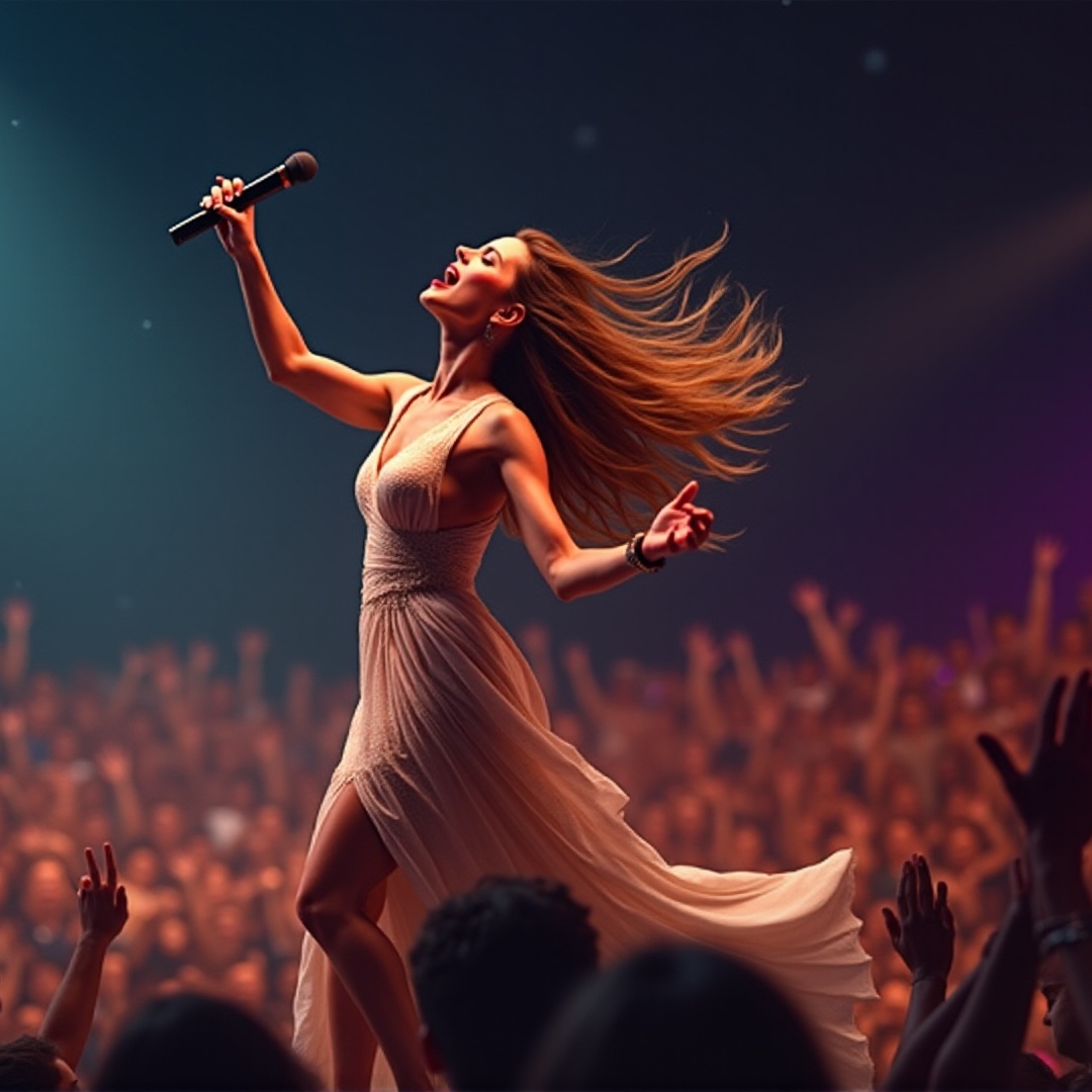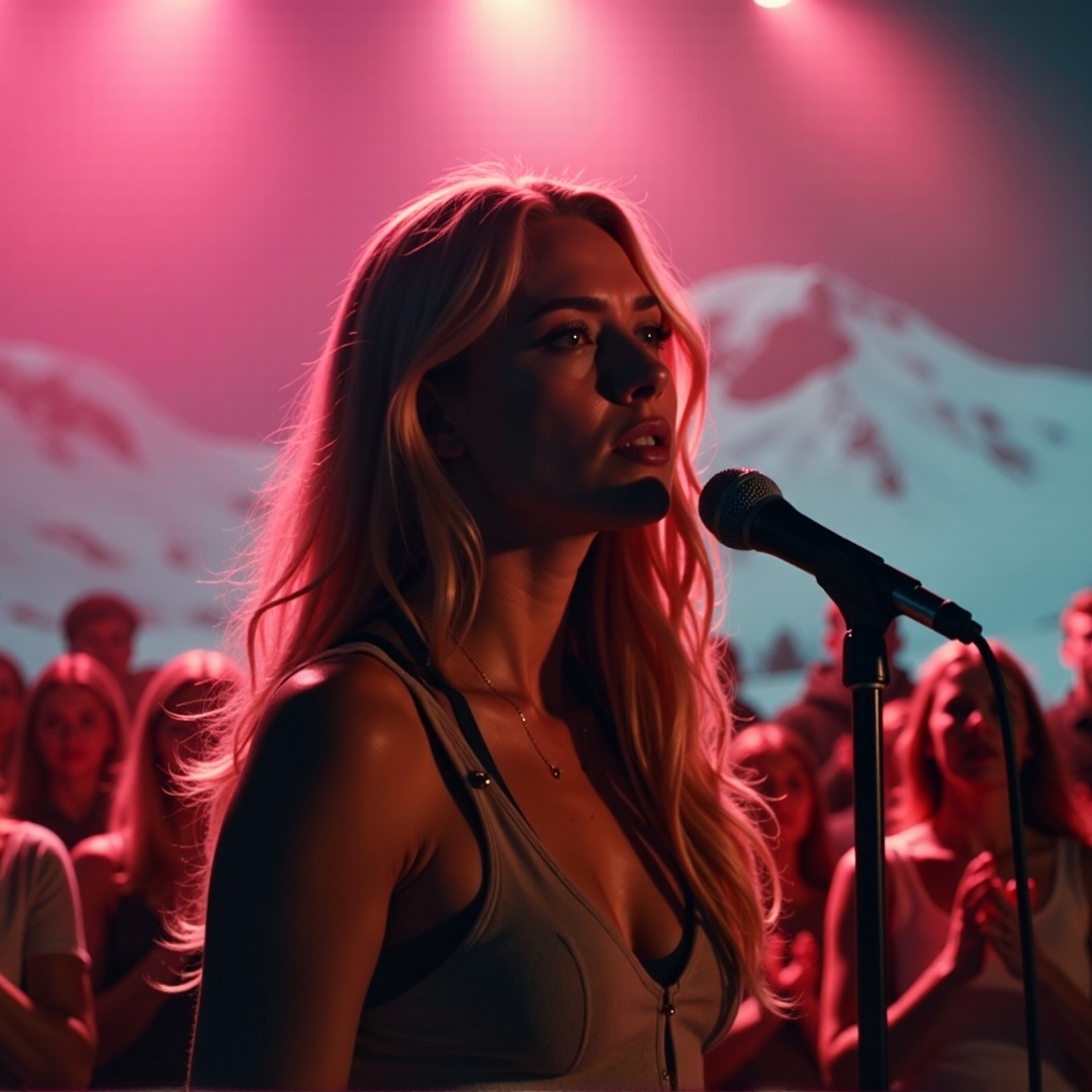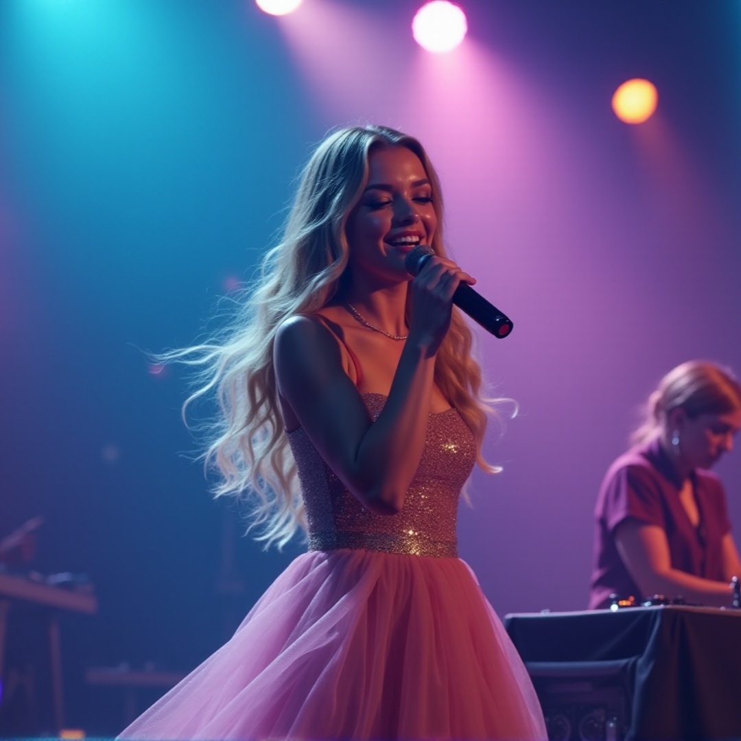 Heavy bass drops, upbeat synths, crescendo to chorus, sforzando emphasis, high-energy female vocals, electric vibe