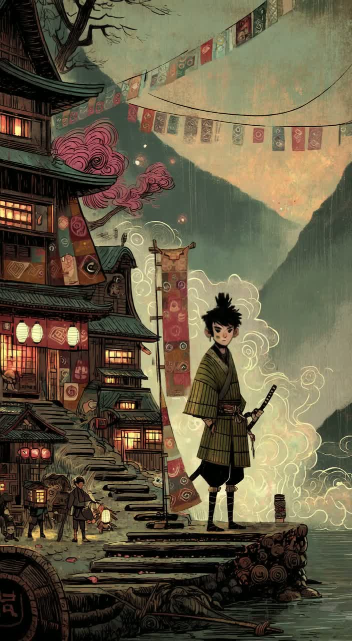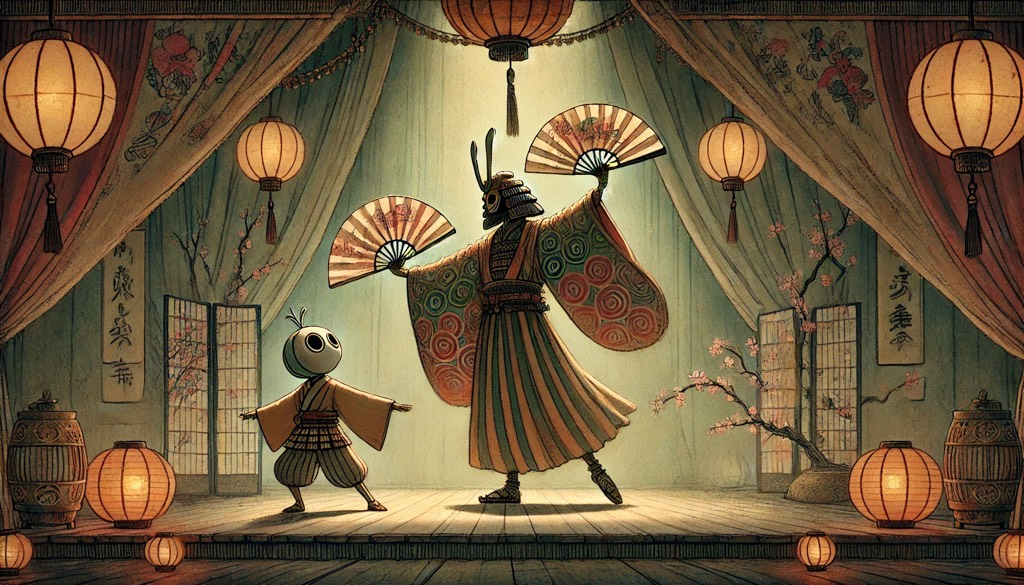 Japanese instruments (shamisen, Taito drums), tv opening theme, punchy, fast paced, triumphant, heroic, whimsical